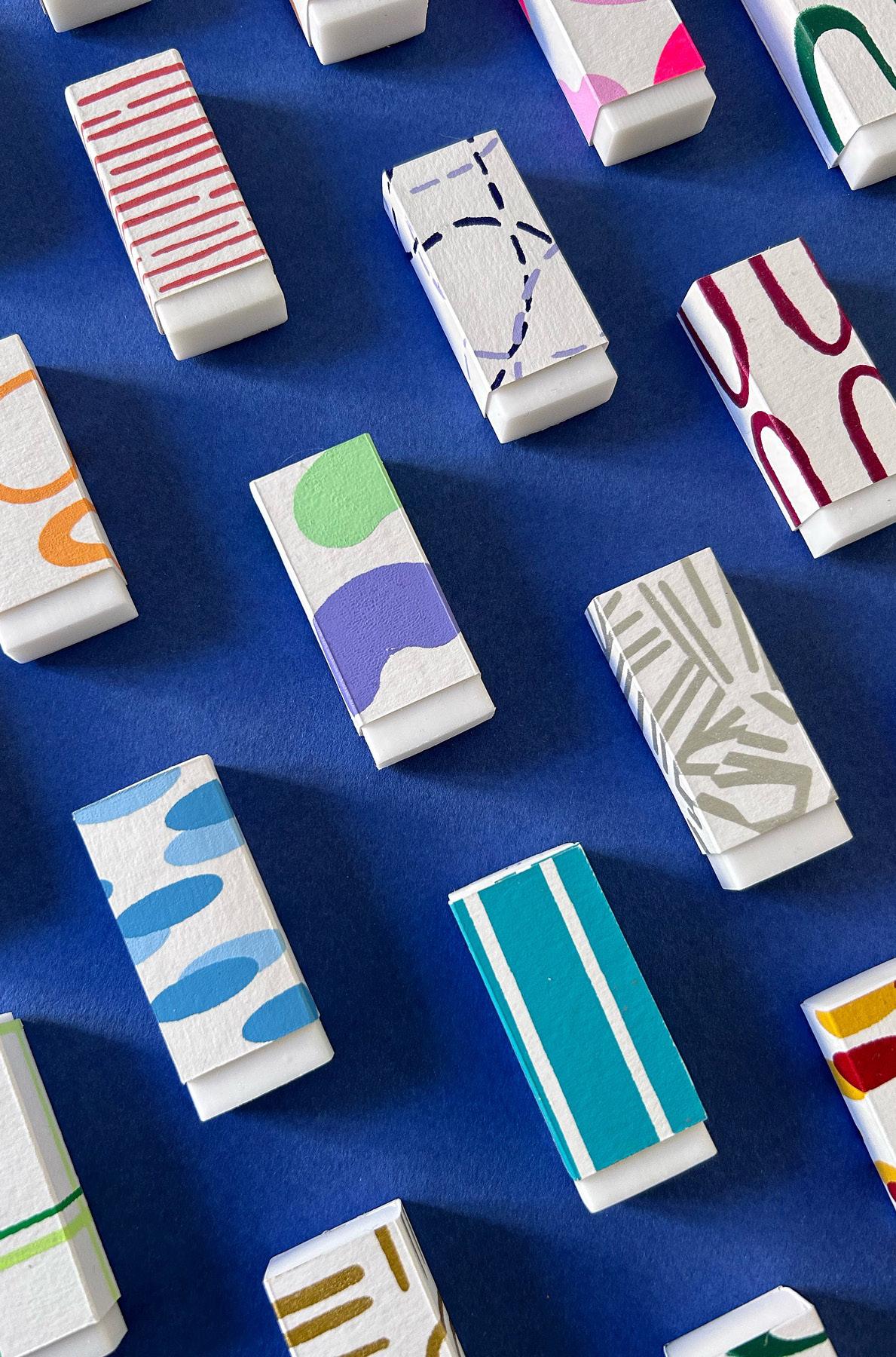 La gamme est composée de différents cahiers et blocs qui permettent de s’exprimer librement. Lignés, quadrillés, blancs, pour écrire ou pour dessiner, les objets que je crée permettent de couvrir un maximum d’utilisations différentes. Elle contient également différents petits objets tels que des gommes ou des décos murales ainsi que des cartes postales