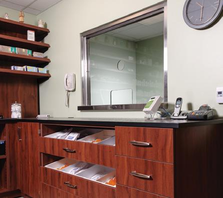 From the Pharmacy work area, it is important for the pharmacist to be able to see the entire pharmacy. Seated modular casework workstations and demountable walls allow a clean line of sight throughout the space.