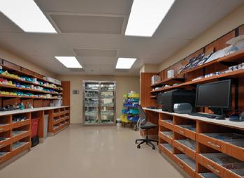 Shipments from drug companies are unpacked in the Break Out/Receiving area. Modular Casework cabinets, shelving units, and workstations allow staff and incoming inventory to become and remain organized.