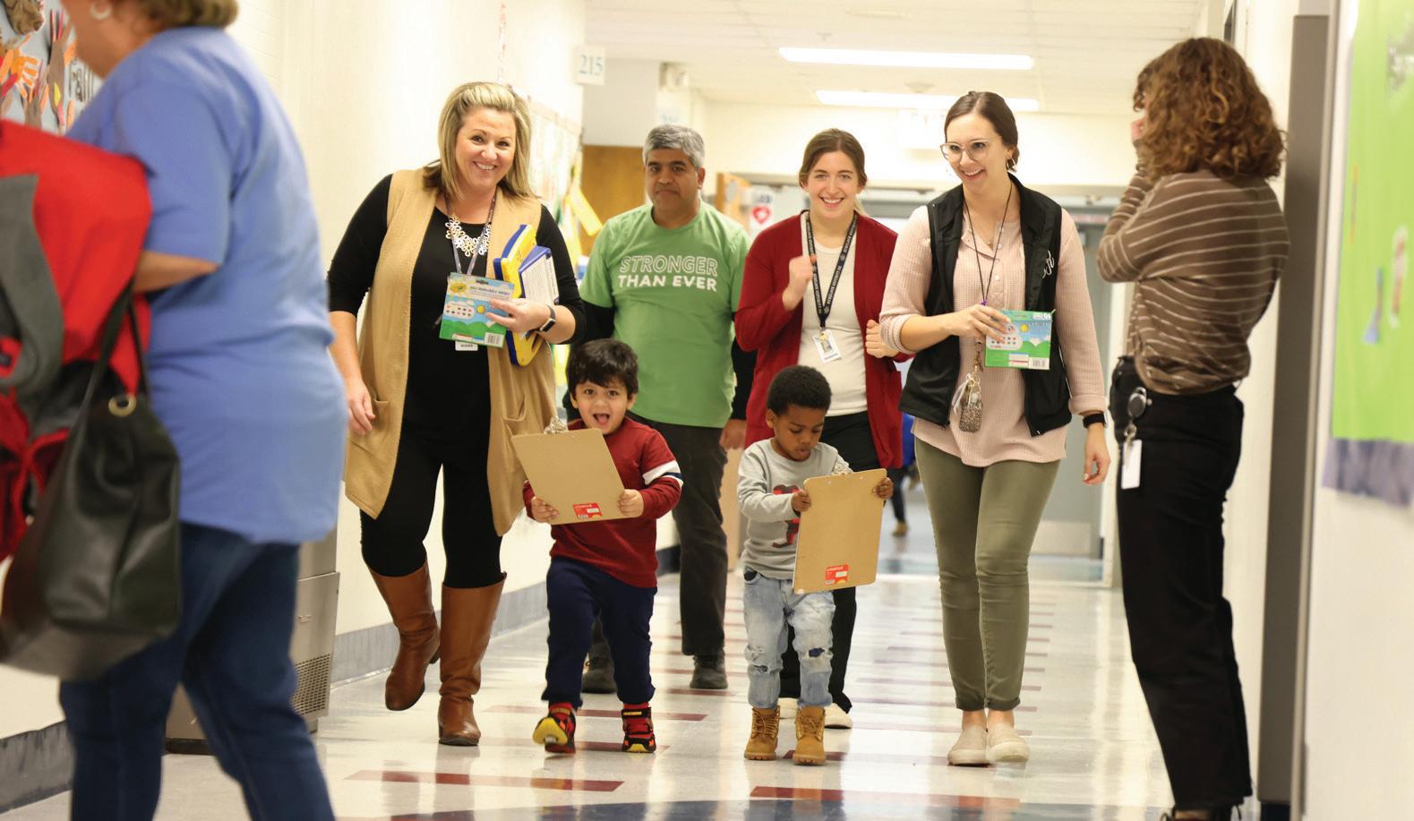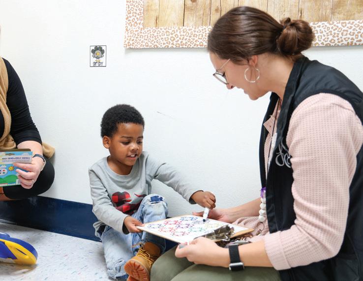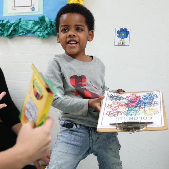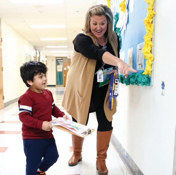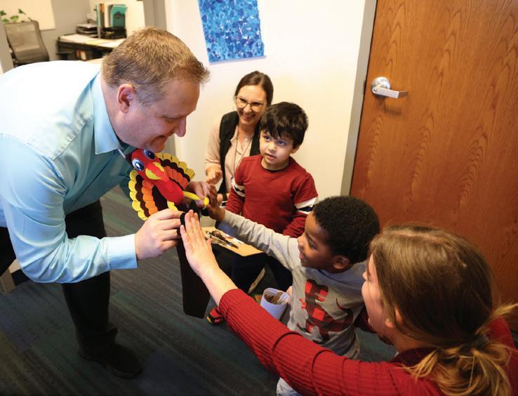 Students in the Cheetah class at the Pattonville Early Childhood Center went on a hunt around the building searching for different colored turkeys. When they located a turkey taped on the wall, they used a marker to color in the corresponding turkey on their worksheet. The activity was a way for students to learn how to follow directions, identify colors and transition in the hallway. After all nine turkeys were found and colored in, they had to find early childhood director Dr. Greg Cicotte who was wearing a turkey tie. Top photo, Cheetah students Shayaanali Ahmed, front left, and Jayce Allen, front right, hold onto their worksheet as they walk through the halls searching for turkeys. They are followed by, from left, speech/language pathologist Stephanie Sliefert, paraprofessionals Tariq Faruqi and Jeni Heeren and teacher Jennifer Sidy. Middle left, Sliefert points out a blue turkey to Ahmed. Middle right, Sidy helps Allen color his gray turkey. Bottom left, Allen shows off his finished worksheet. Bottom right, Cicotte shows off his special turkey tie after the early childhood students finished their turkey hunt.