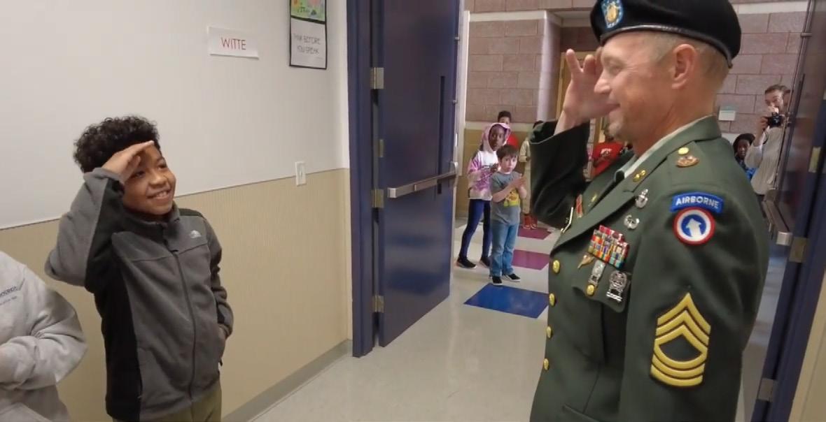Fifth grader Calvin Holloway, left, salutes Army veteran Master Sgt. Mark Lacey during Drummond Elementary School’s Veterans Day Torch Run. Following the run, Lacey talked with students about his military experience and shared photos, displays and awards. He also gave out paratrooper parachute toys and autographed pictures and writings the students made about the Torch Run.