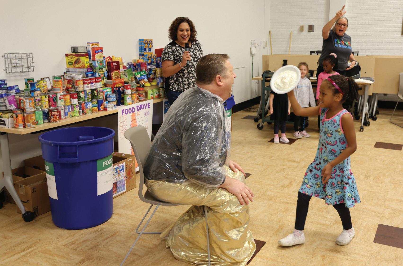 The Pattonville Early Childhood Center hosted a food drive to support local food pantries. Director Dr. Greg Cicotte challenged the students to collect 300 cans or boxed food items and promised that if they topped that goal, he’d let them hit him in the face with a pie. Needless to say, he underestimated his students who collected more than 800 items.