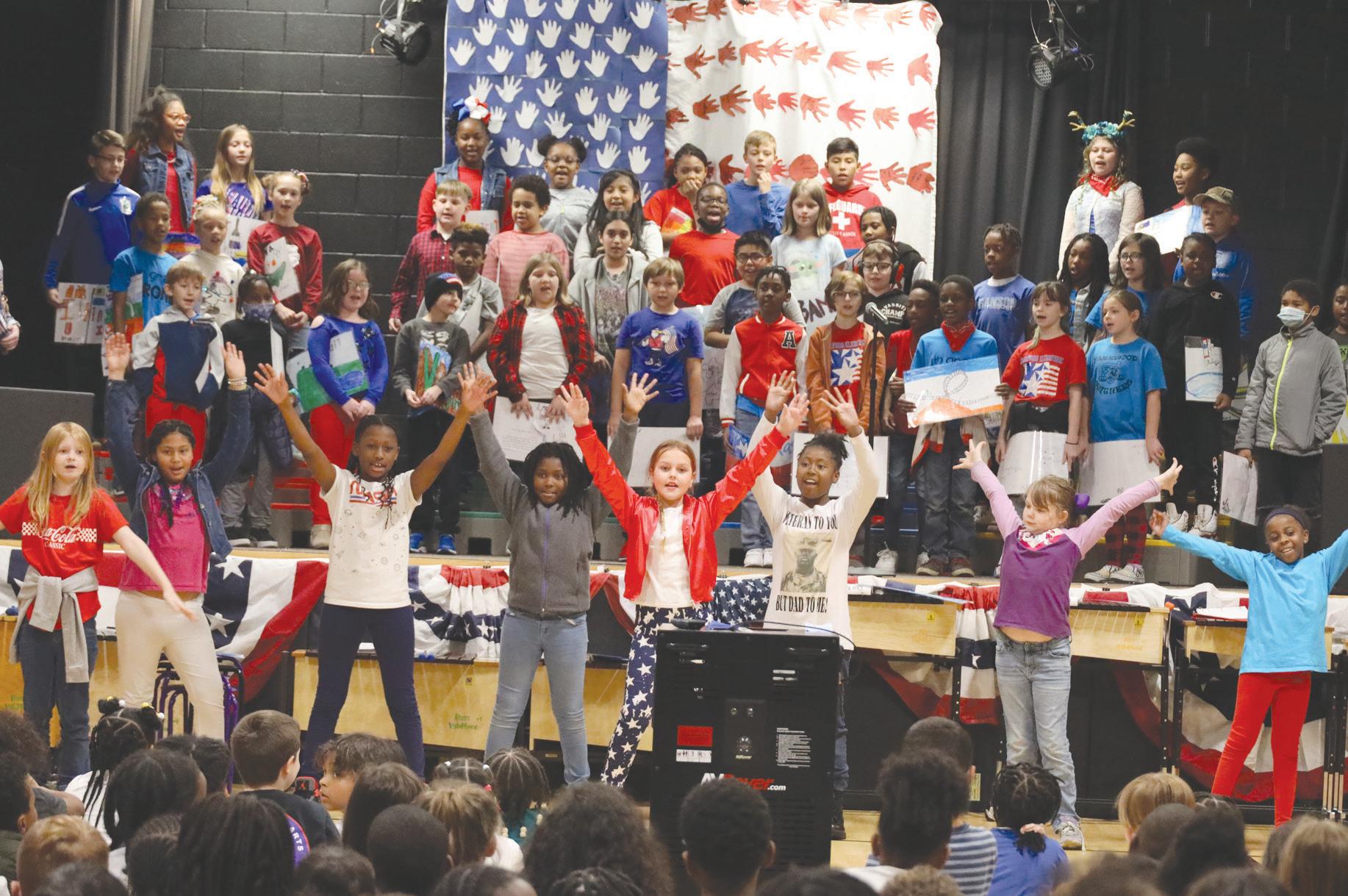 Fourth grade students at Parkwood Elementary School spearheaded a Veterans Day concert. They chose jobs, including: ushers who directed people to their seats and designed the concert program; a set crew that helped design and construct the backdrop; a set up crew; script writers; and dancers, who learned a choreographed dance created by another student. First graders also participated in the performance. Additionally, all students were assigned a state in art class and designed a poster to hold during the “Fifty Nifty United States” song at the concert. To learn more, see the story on page four.