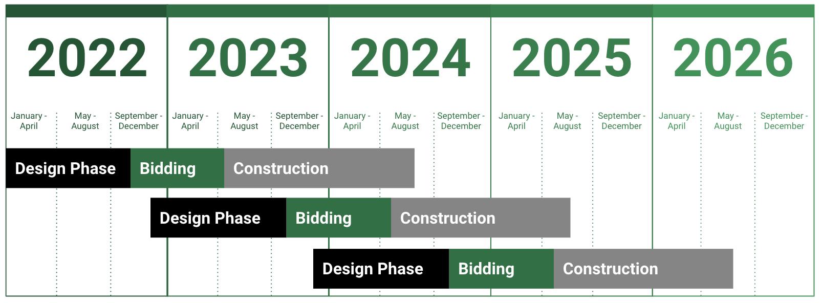 To see a current timeline of phases and a breakdown of the projects in each phase, see the images below and at right. To learn more about Prop S and see updates about bond projects, visit https://bit.ly/PattonvillePropS.