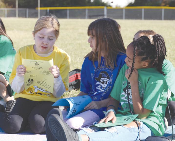kicked off with students receiving a T-shirt matching their ship’s color. Wearing their new shirts, everyone headed outside where the word “LEADER” was written in large chalk letters on the playground blacktop. Each ship took a letter of the word and filled the lines to capture the annual leader photo, which will be framed and added to a hallway with the photos from previous years. Afterward, the six ships met with their shipmates to meet new members and learn about their ship. Each color of the rainbow is represented by a ship at the school: blue for Pacificae, meaning peace; orange for Viribus, meaning strength; green for Spero, meaning unity; red for Animo, meaning courage; purple for Statera, meaning balance; and yellow for Felix, meaning happiness. Each ship also has its own motto and positive habit to focus on.