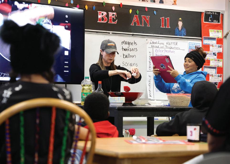 Parkwood Elementary School kindergarten teacher Christina Livingston, center, helps students Demi Williams, left, and Ava Gumble from Abigail Beckermann’s kindergarten class create art using peg boards and meltable plastic beads.