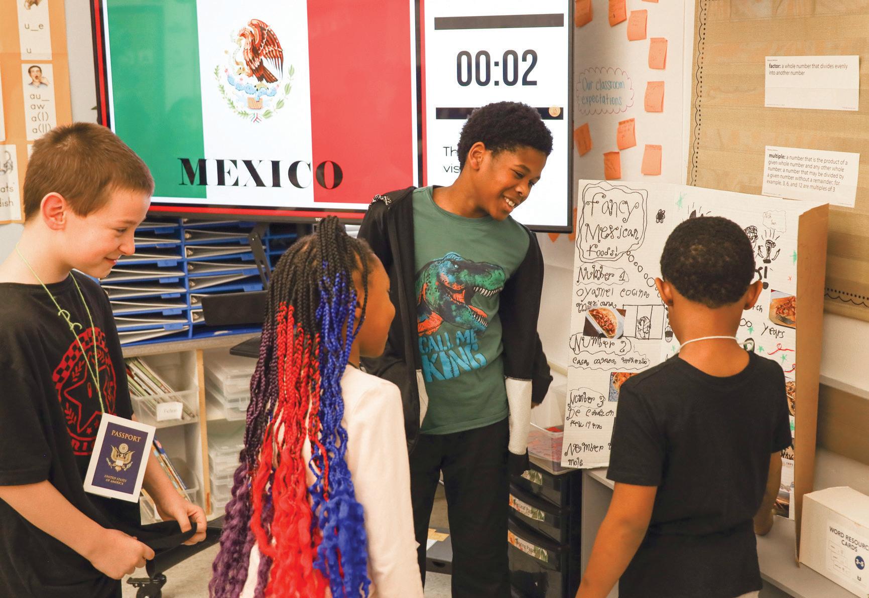 Samuel Lowe, second from right, a fifth grader in Erin Hanson’s class, shares information about Mexico with second graders in Amanda Starwalt’s class during the school’s International Day celebration. The second graders are, from left, Chadwick Harris, Brooklyn Davis and Jeremiah Hunt.