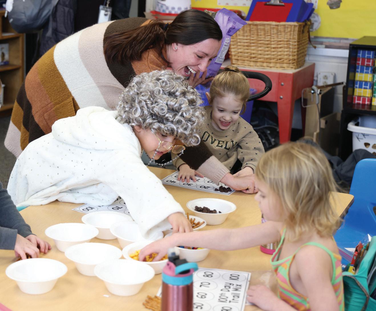Throughout Pattonville School District, kindergarten students celebrated a big milestone on Jan. 31. They marked the 100th day of school with counting activities, creating paper hats, reading special stories and dressing up. Top photo, Madison Latchison, center, and her classmates in Anise Glenn’s kindergarten class at Willow Brook Elementary School, give a thumbs up They are from left, Riley Griffin, Macklin Dunavant, Annie Lockwood, Kyrie Betonio and Arya Shah. At left, Remington Traditional School kindergarten teacher Ashley Fults, second to left, helps Aleks Flowers Courtney count 100 chocolate chips while Haddie Carter, left, and Virginia Wininger complete their own 100 count. Above, Grayson Lloyd, left, and Gio Flores decorate and cut out their 100th day hats in Megan Hayes’ kindergarten class at Bridgeway Elementary School.