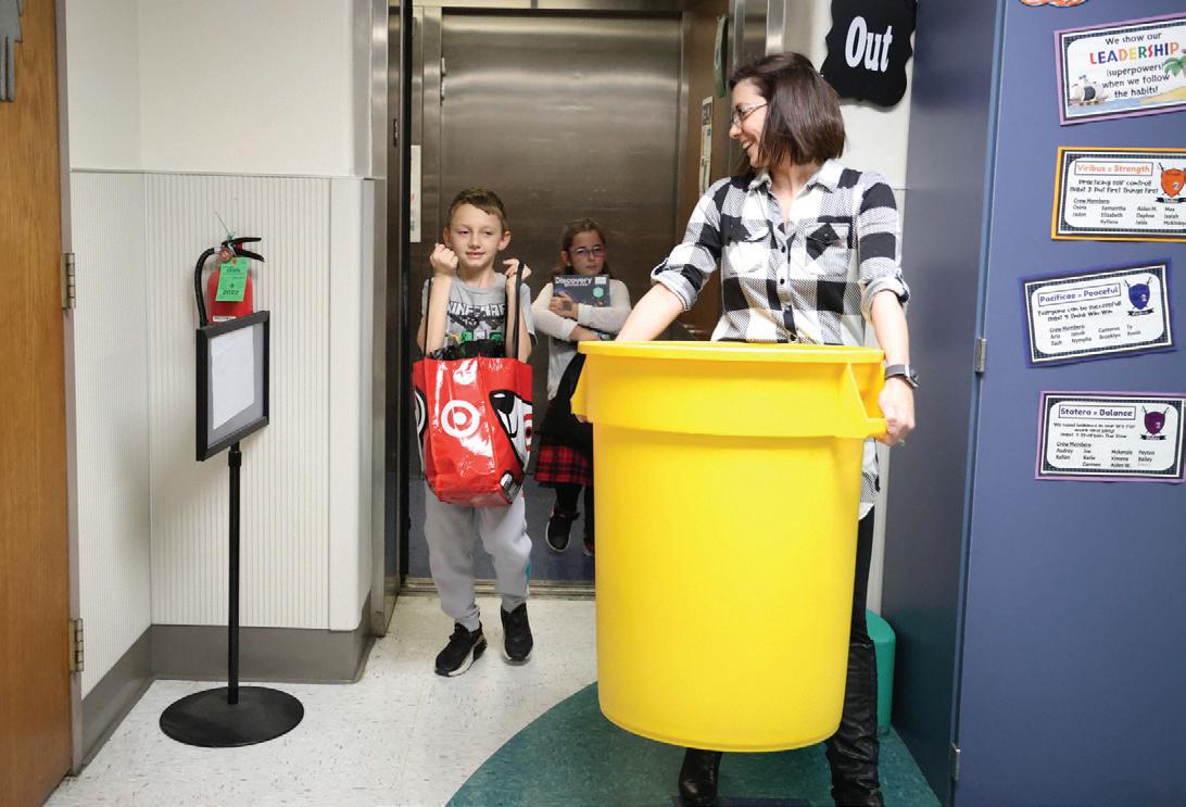 Second grader Maxwell Schneider, left, and first grader Lola Dafflitto, center, help PEGS teacher Allison Bennett bring donated toys up to their classroom on a higher floor at Rose Acres Elementary School.