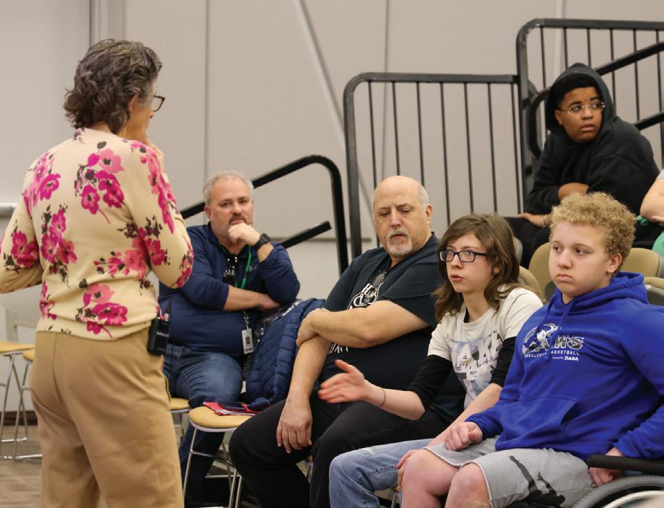 by Alan Gratz. They heard from Vera Emmons, left, whose mother survived the Holocaust. During a Q&A session, Westerly Woods, second from right, asks Emmons a question. From left, science teacher Mike Burgio, SSD teacher assistant Ken O’Keefe, Andrew Bryson, right, and Noah Smith, back, listen.