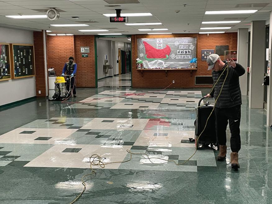 Left, director of facilities David Winslow, left, walks with lead maintenance journeyman Tom Samples on Dec. 24 to assess the impact of the water main breaks at the high school. Right, custodian Brenda Labbe uses a wet vac to dry off floors in the high school main entrance.