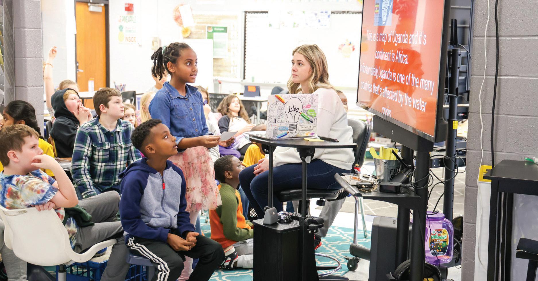 Bethel Fantahun, a fourth grader at Remington Traditional School, shares what she learned about Uganda while researching the global water crisis. Fourth grade is team taught by Julie Linck and Alyssa Lipson, right.