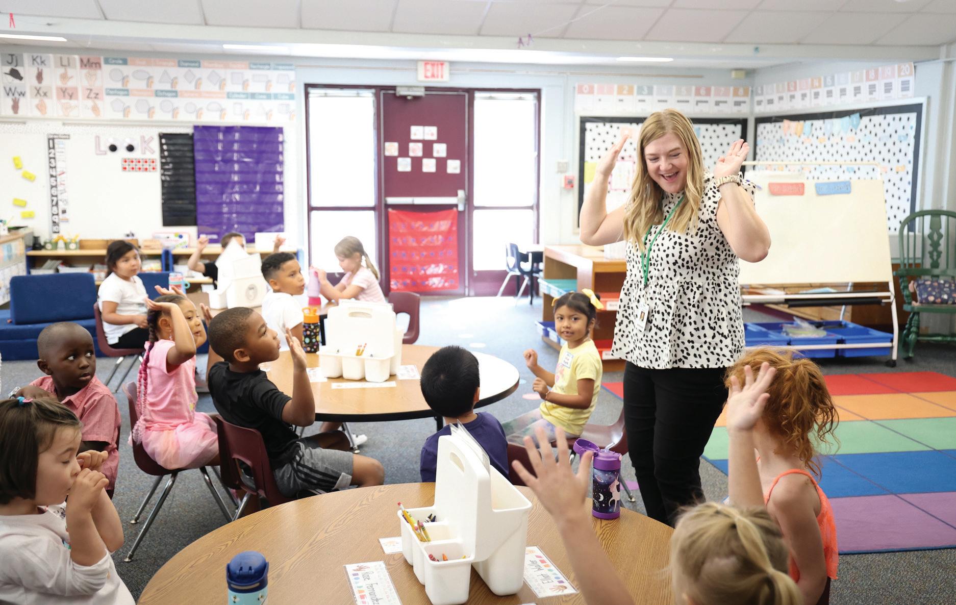 Bridgeway Elementary School teacher Christa Griffith plays a get-to-know-you game with her kindergarten class on the first day of school.