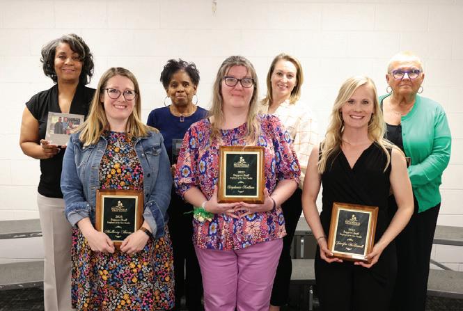 Staff members were selected as building Support Staff of the Year. From left, front row, district finalists are Mallorey Burns, Stephanie Kellner and Jenny McDowell and, back row, semifinalists are Vickie Moore, Renee Davenport, Christina Finazzo-Purl and Debra Dold.