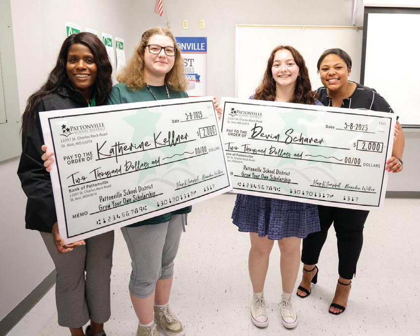 Pattonville High School seniors Katherine Kellner and Devin Scharer received the inaugural Pattonville School District Grow Your Own Scholarship. They were presented with $2,000 ceremonial checks by director of human resources Candice Wayne in a surprise announcement in May. Both students are enrolled in Janet Kuhn’s College Credit Education and Teaching Internship class and have plans to major in education in college with the hopes of returning to teach at their alma mater. Kellner plans to be a high school math teacher and will attend Lindenwood University. Scharer hopes to teach high school science and will attend Mizzou.