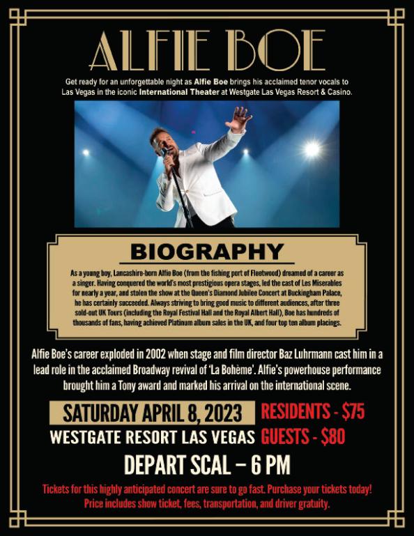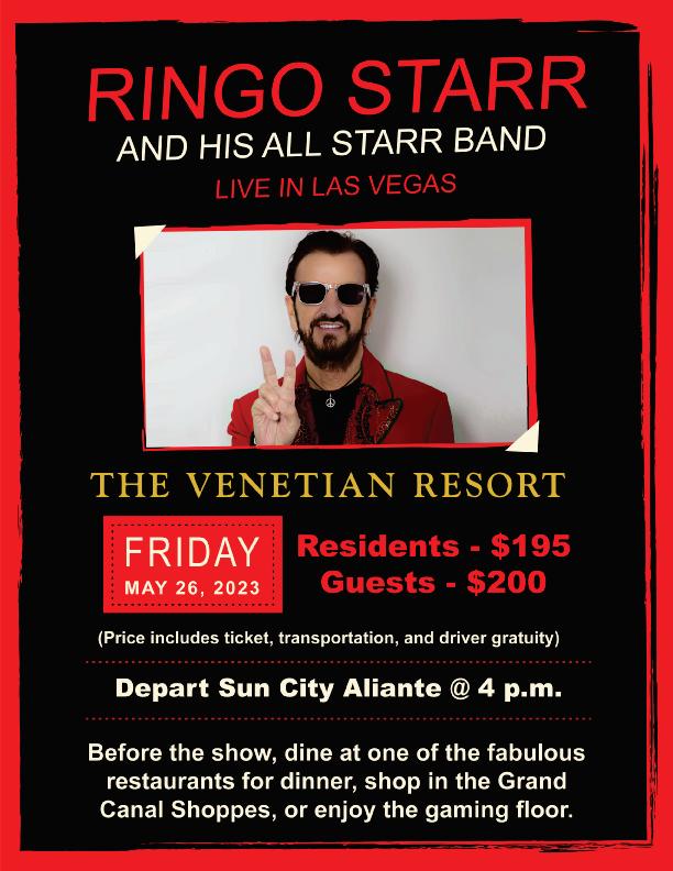May 2023 Edition 236 SUN CITY ALIANTE NAMED OUTSTANDING LARGE ASSOCIATION FOR 2022 2023 BOARD OF DIRECTORS ELECTION LEARN HOW TO LIVE WITH & ENJO WILDLIFE SPRING ART & CRAFTS SHOW SPECIAL EVENTS HIGHLIGHTS - –LEGENDARY ROD STEWART THE COLOSSEUM SUN CITY ALAINTE'S SPRING FLING SOCIAL – FREE FOR RESIDENTS THE WIZARD OF OZ THE SMITH CENTER THE ICONIC RINGO STARR AND HIS ALL STARR BAND – VENETIAN RESORT CIRQUE DU SOLEIL'S THE BEATLES LOVE MIRAGE HOTEL & CASINO THE ULTIMATE SHOWMAN EARL TURNER – THE SMITH CENTER SINGER & ENTERTAINER DAWN FELLMER – VIST ROOM