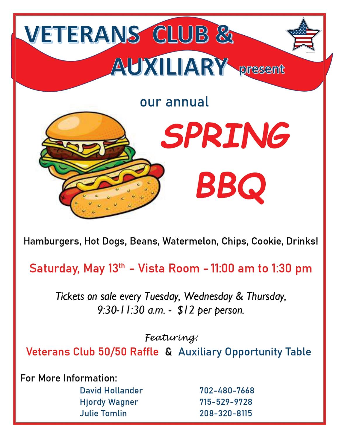 Veteran’s Auxiliar y of Sun City Aliante. Meets the 3rd Tuesday, 9 a.m. Contact Hjordy Wagner at 715529-9728 and hwiz wag@gmail.com or Julie Tomlin at 208-320-8115 8115 and jtomlim55@msn.com