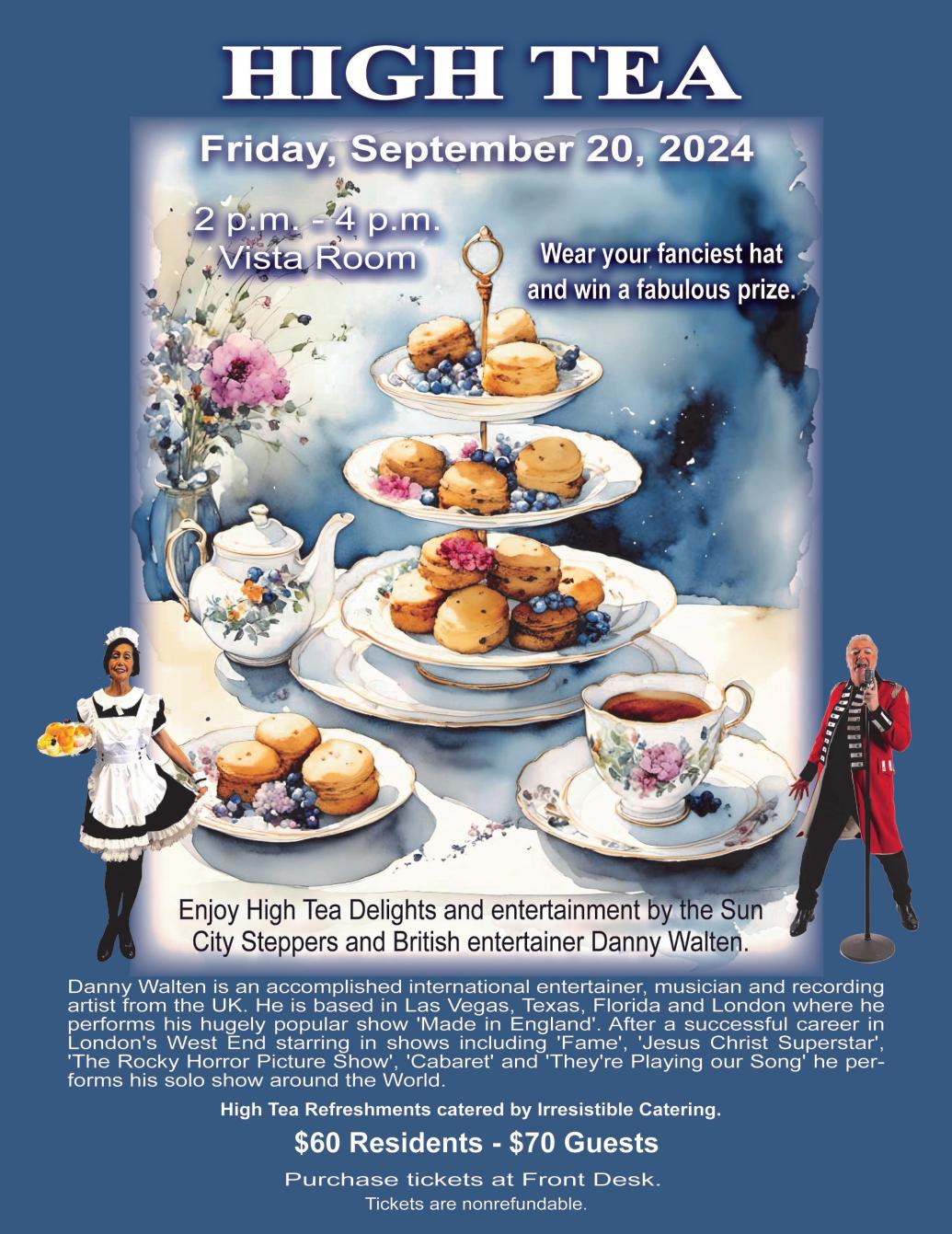 Enjoy traditional high tea foods and teas and entertainment provided by British Entertainer Danny Walton and the Sun City Aliante Steppers.