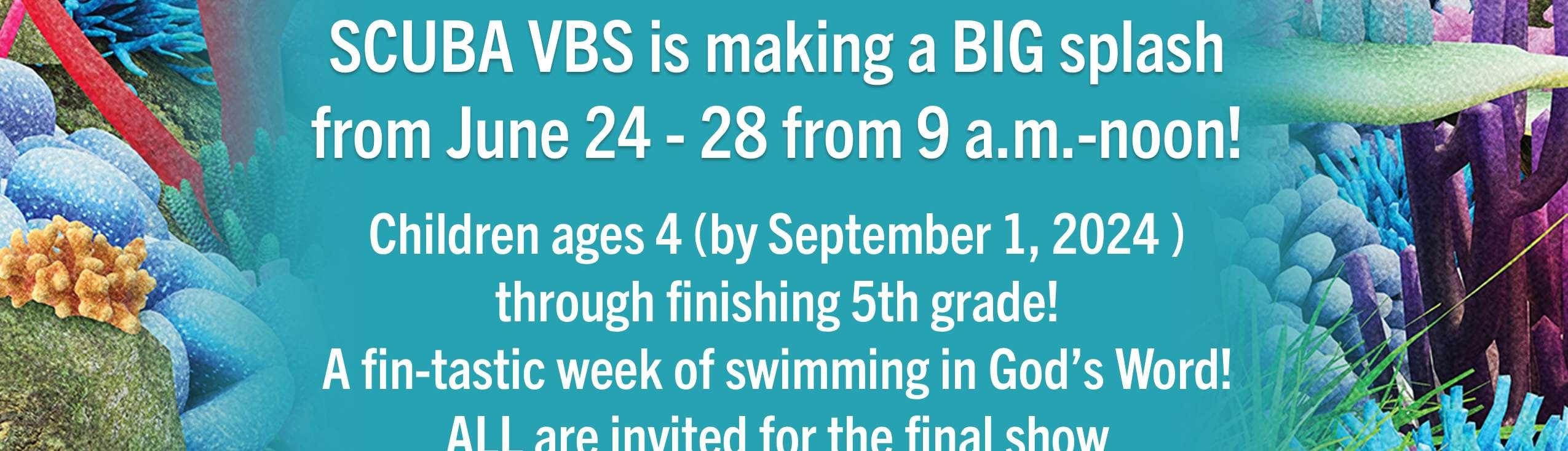 SCUBAVBSwillrunfromJune24th–28thfrom9:00a.m.tonoonandisopento childrenages4(asofSeptember1,2024)through5thgrade.Kidswilldivedeepinto anamazingunderseaadventurewherethey’llexperiencetheever-flowing,neverendingloveofGod.TheywillbeimmersedintheWordanddiscoverwhat‘living water’isreallyallabout!