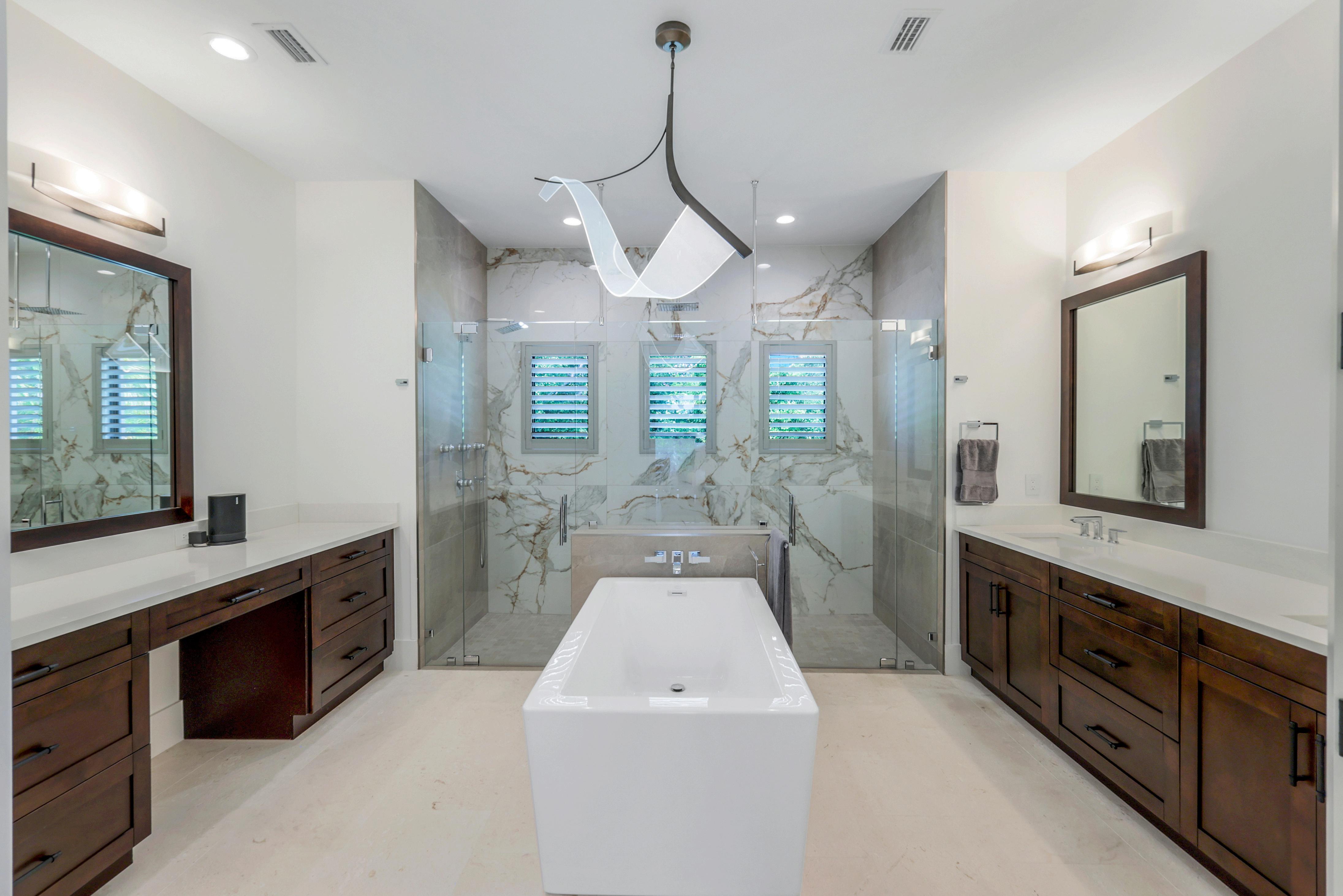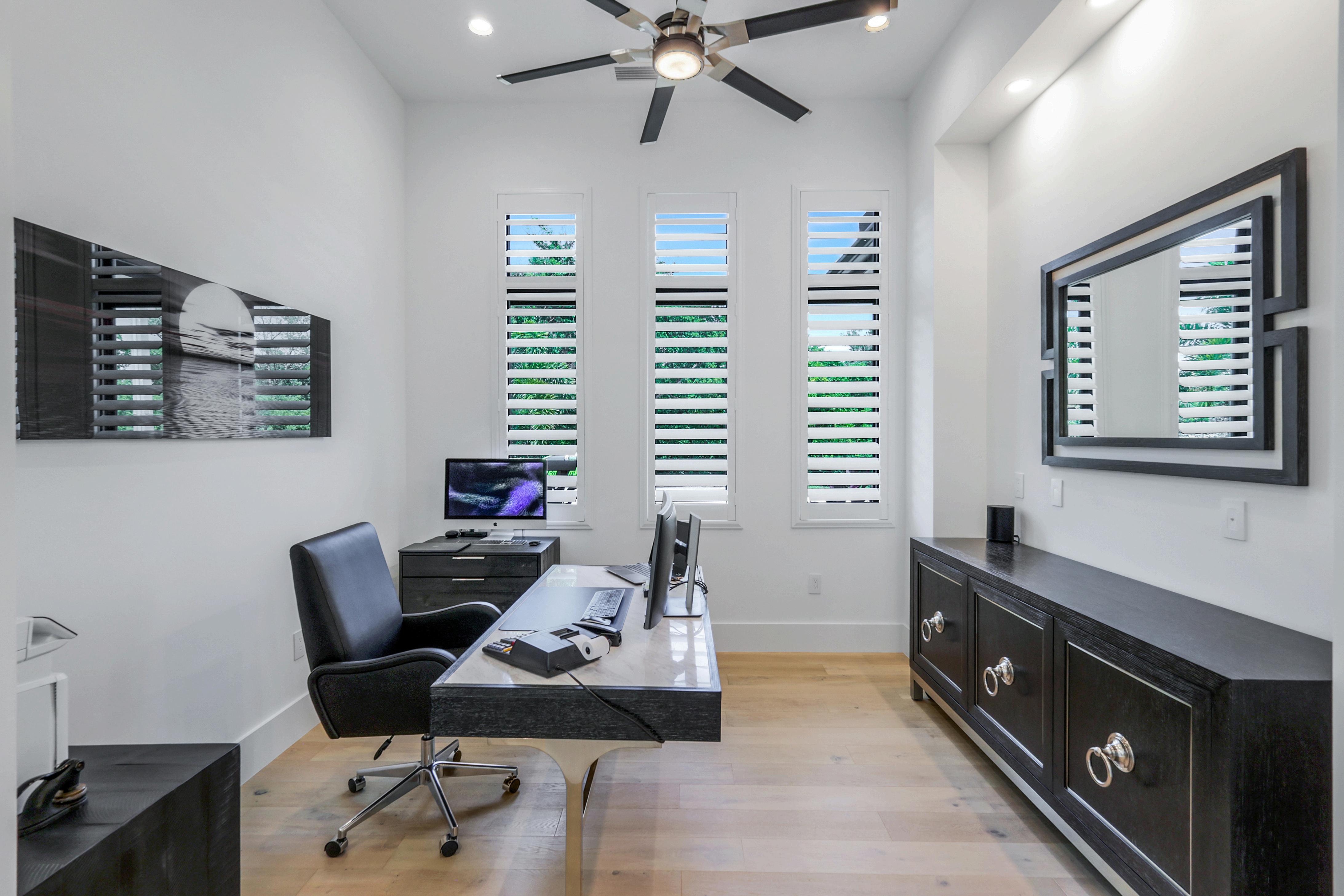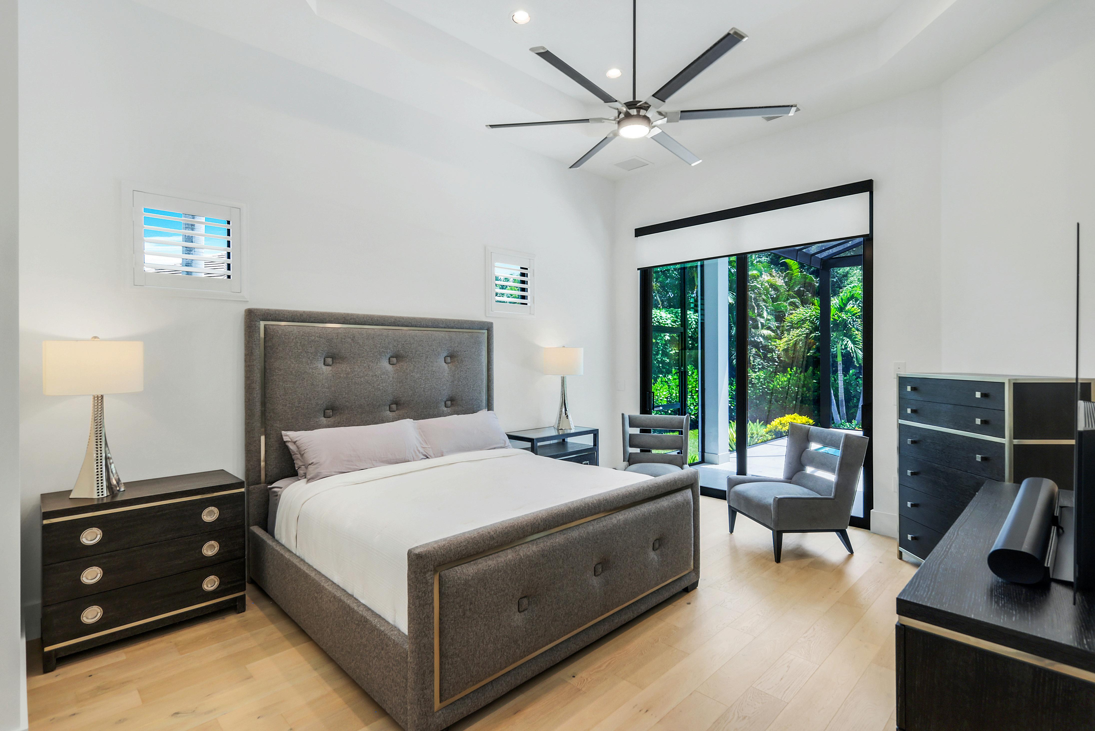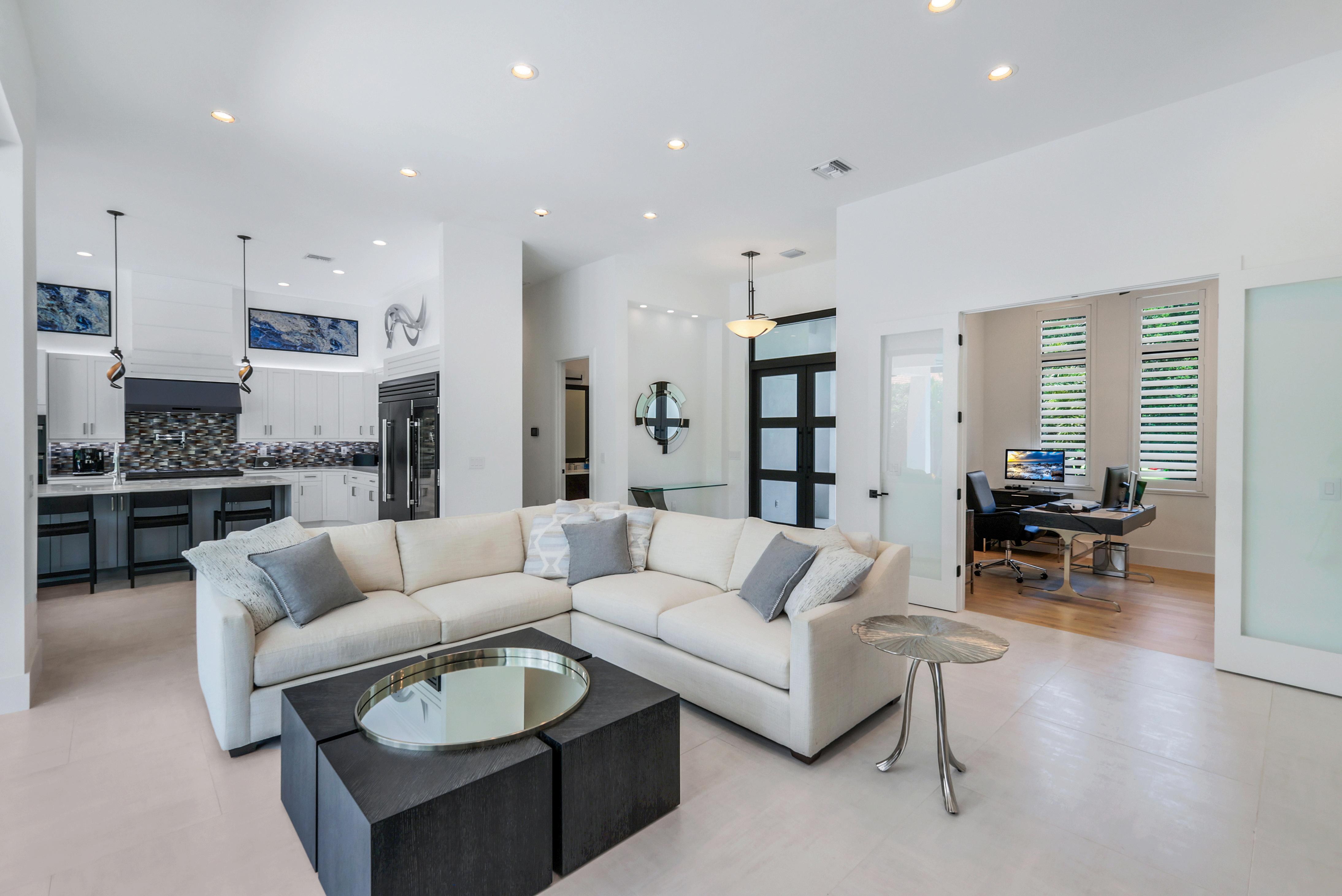 Thoughtful features include a whole house sound system, Porcelanatto engraved tile flooring, impact glass windows, automatic blinds with wall remotes, LED recessed lighting, and exceptional Hubbardton Forge lighting fixtures. The impeccable furniture complements the clean, sleek lines, accentuating the modernity and sophistication of the home.
