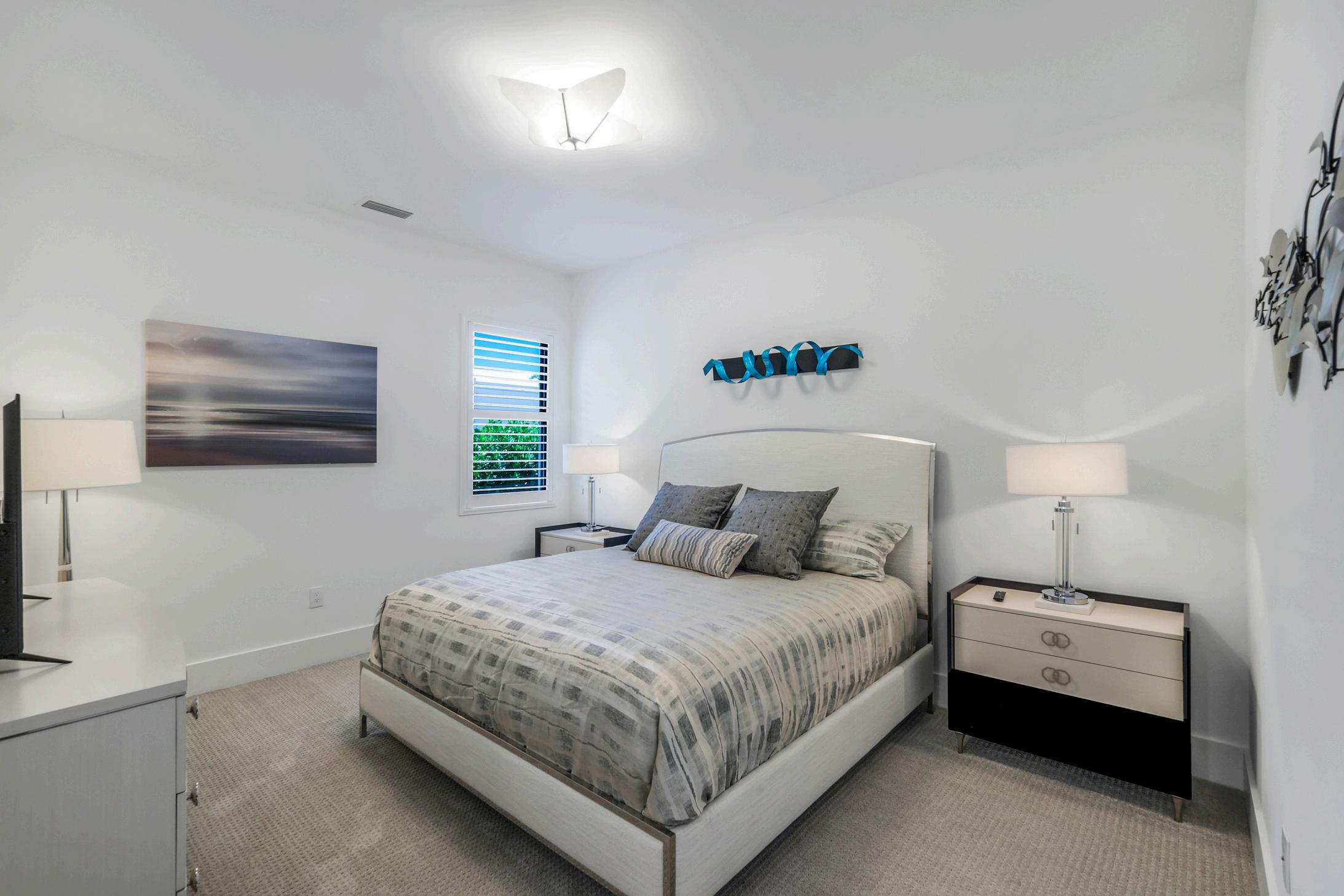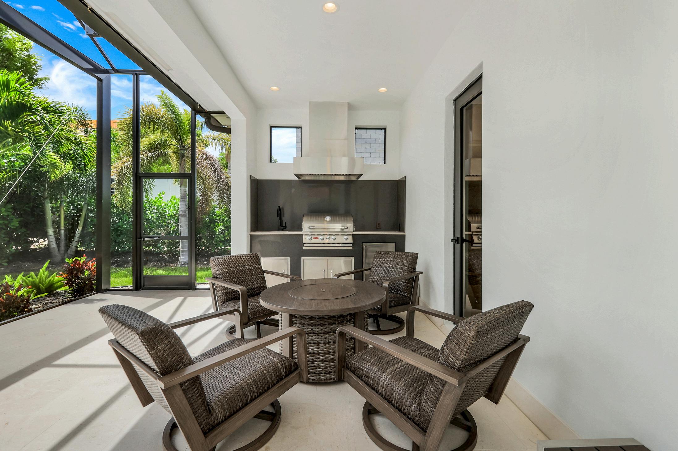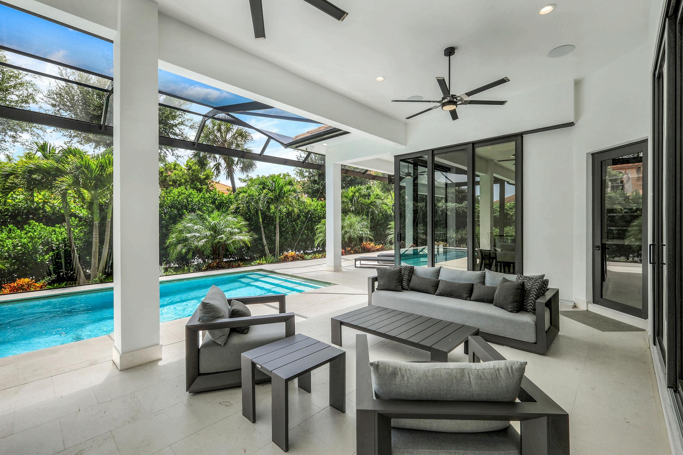 Thoughtful features include a whole house sound system, Porcelanatto engraved tile flooring, impact glass windows, automatic blinds with wall remotes, LED recessed lighting, and exceptional Hubbardton Forge lighting fixtures. The impeccable furniture complements the clean, sleek lines, accentuating the modernity and sophistication of the home.