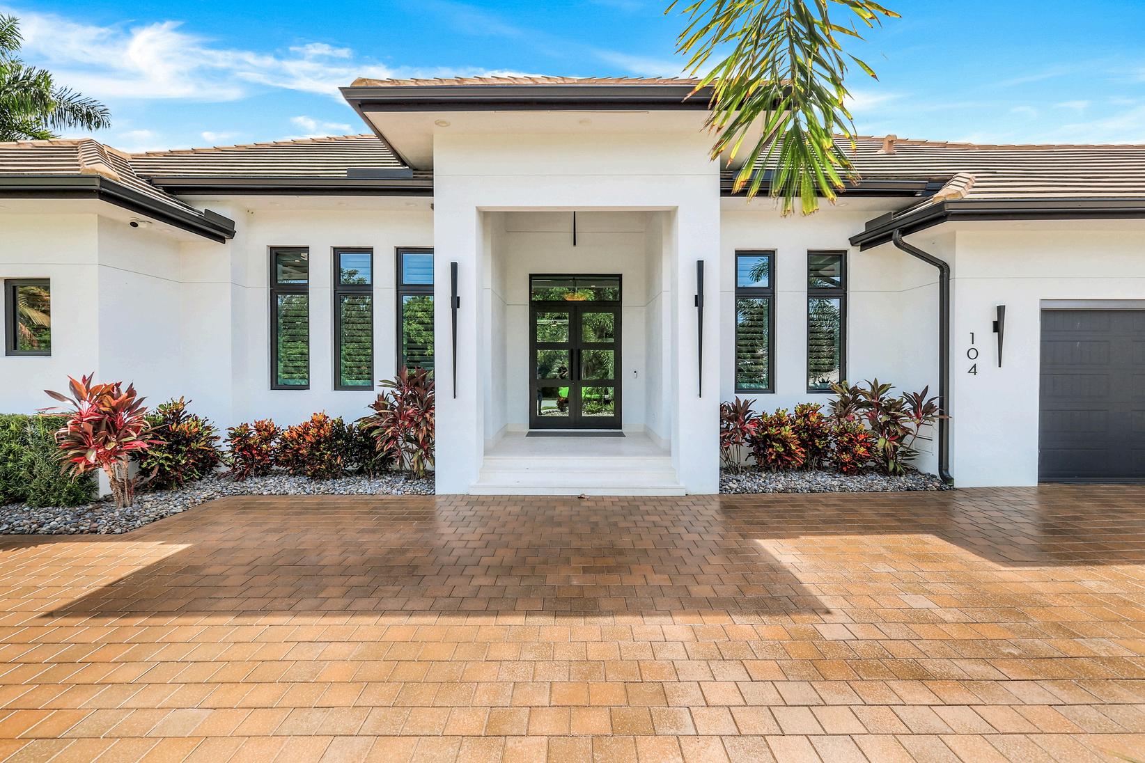 Pavered Circular Driveway with lush tropical landscaping and designer night lighting