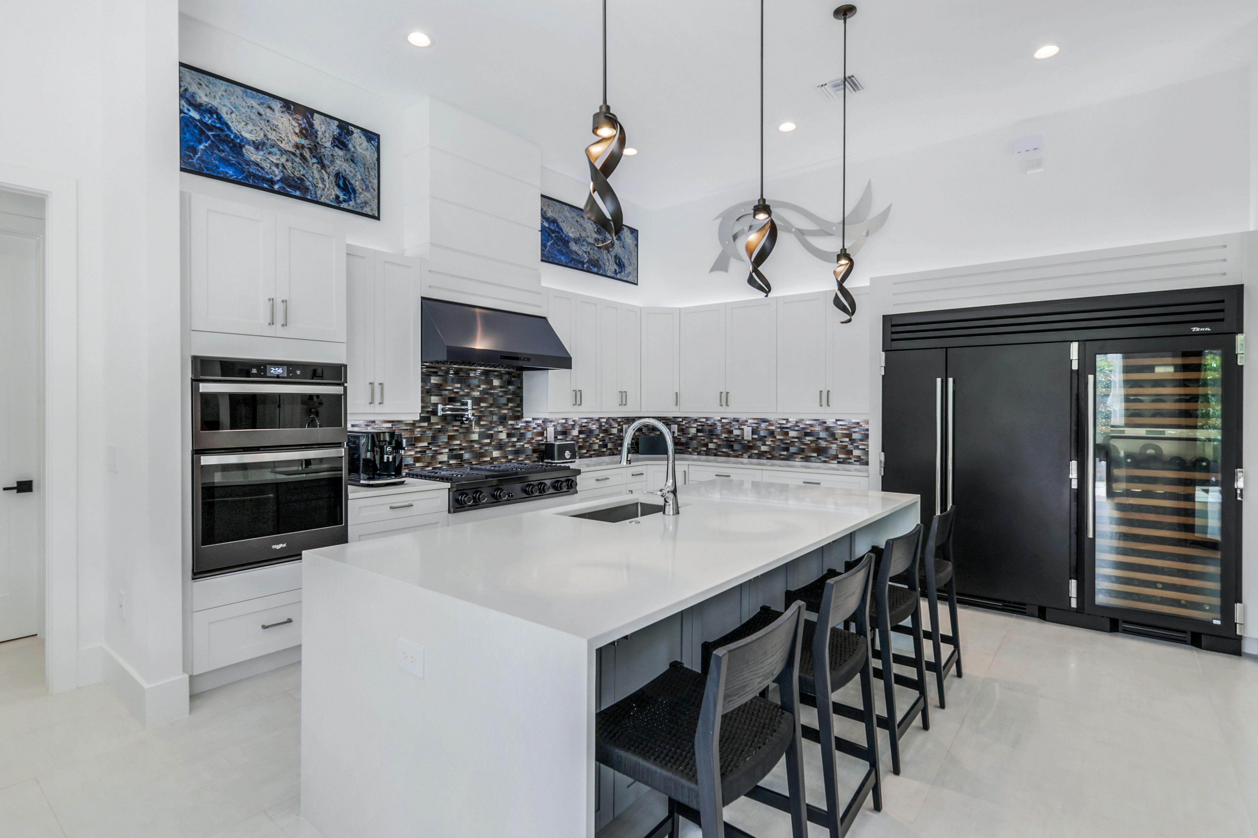 The open Great Room floor plan seamlessly connects to the chef's kitchen boasting a large island with quartz waterfall countertops and breakfast bar, a gorgeous glass tile backsplash, a commercial True refrigerator suite with full-size wine cooler, a 6-burner gas cooktop, a pot filler, and under/over cabinet lighting. Open to the dining area, it overlooks the pool through zero-corner slider's.