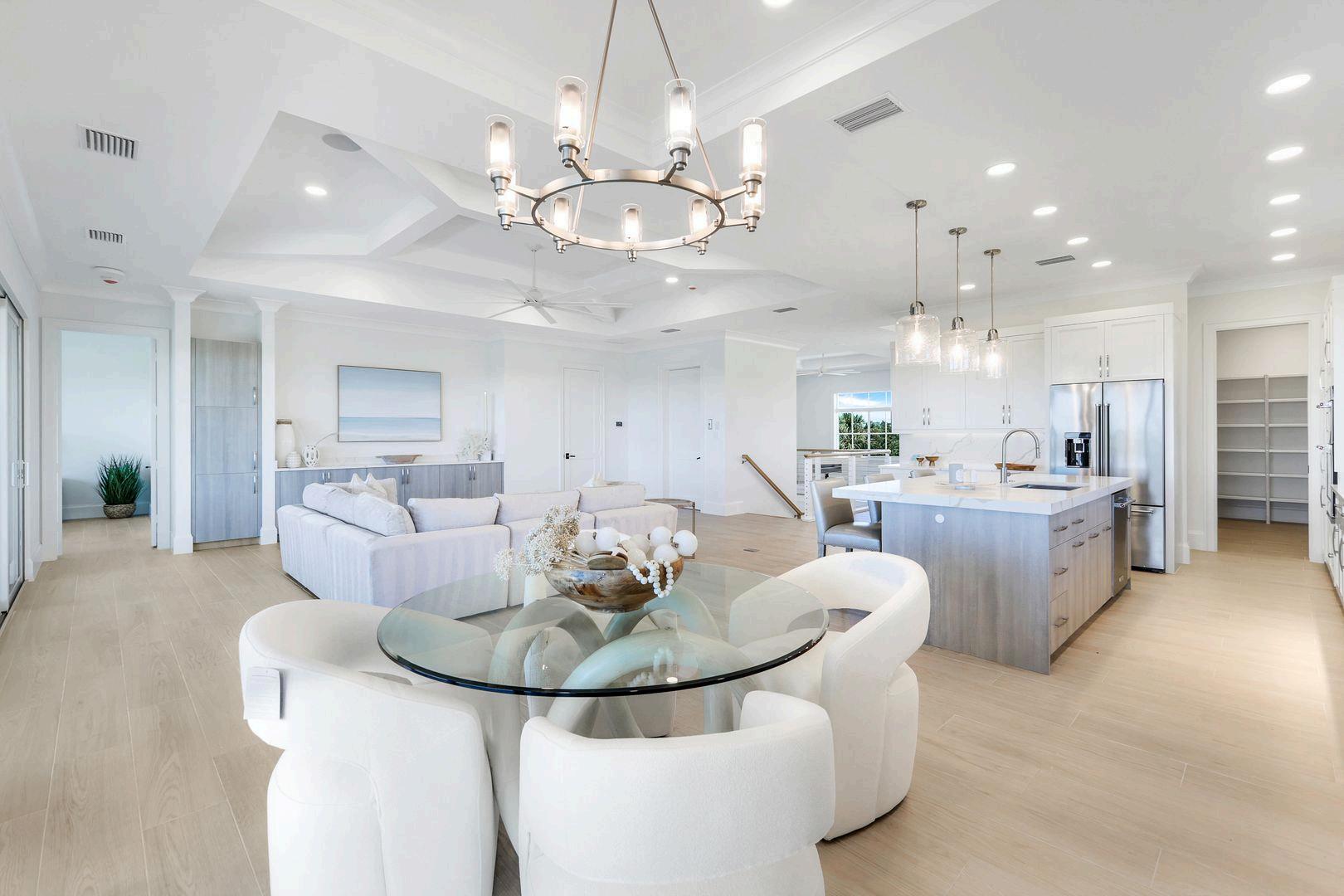Gourmet kitchen with dining area, 4-seat breakfast bar on oversized center island with Gulf views
