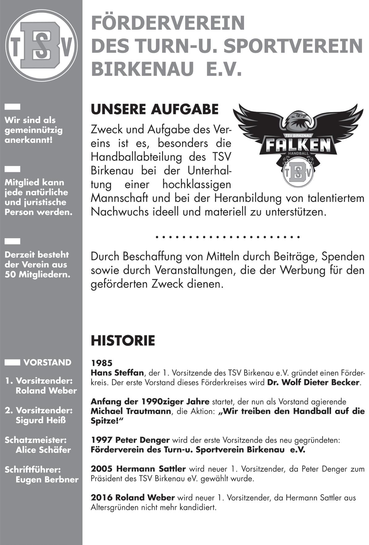 Zweck und Aufgabe des Vereins ist es, besonders die Handballabteilung des TSV Birkenau bei der Unterhaltung einer hochklassigen Mannschaft und bei der Heranbildung von talentier tem Nachwuchs ideell und materiell zu unterstützen.