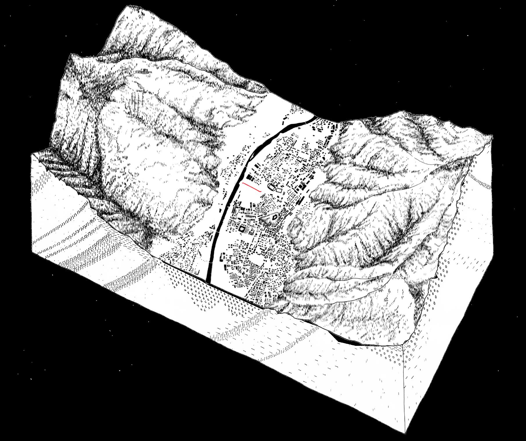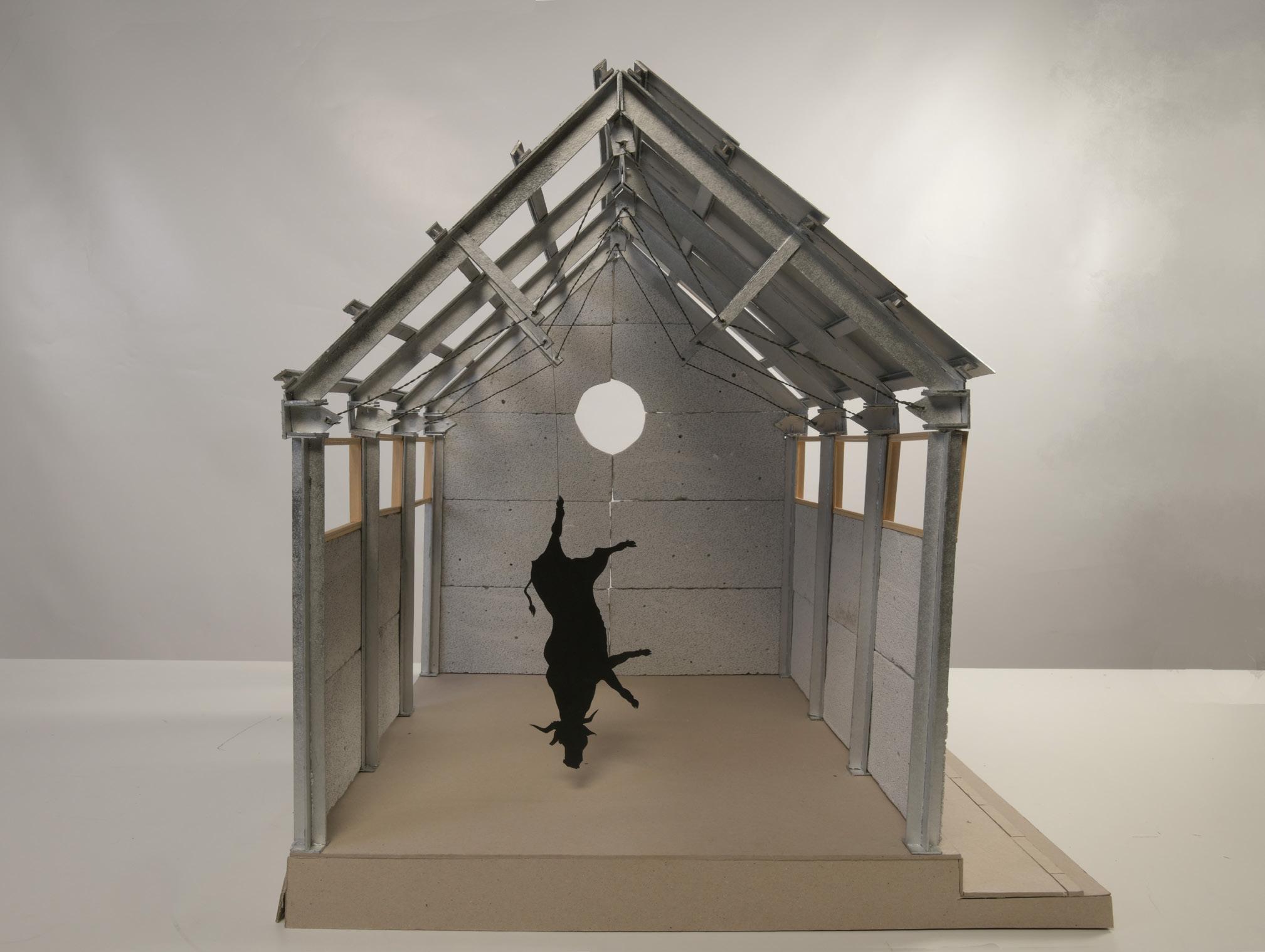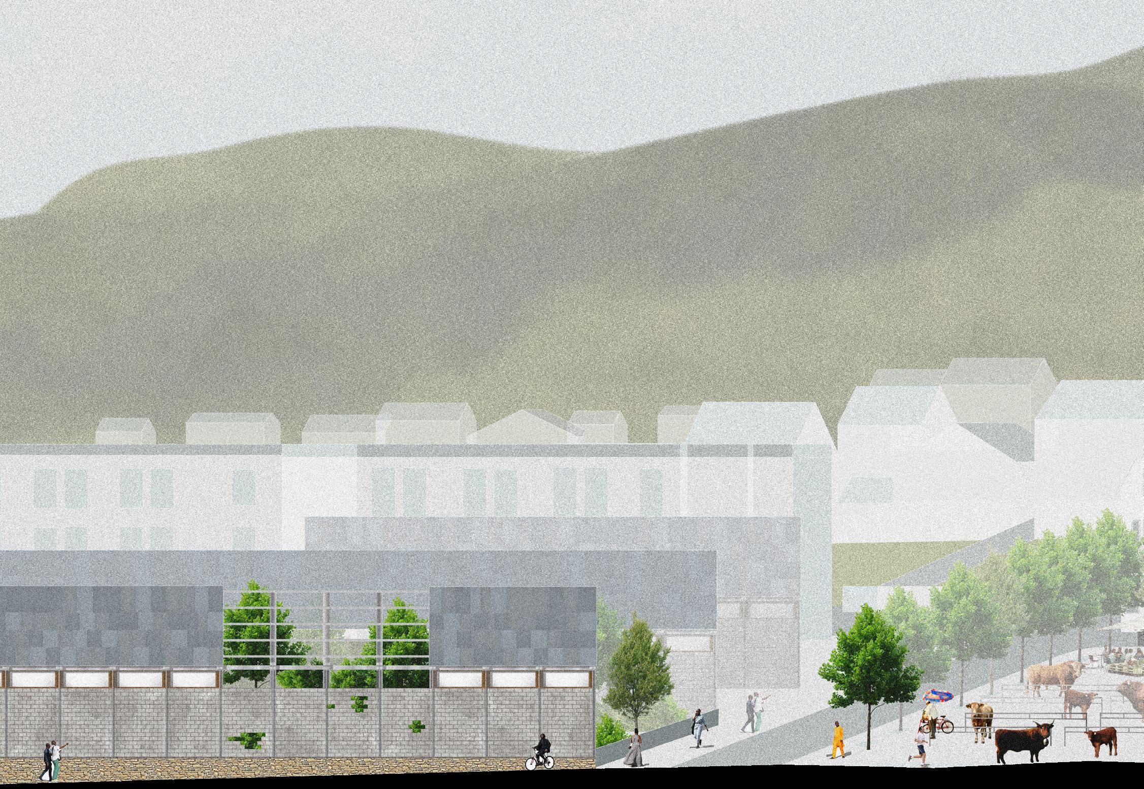 Nous avons collecté des informations sur site, par la rencontre des acteurs locaux. Ce relevé a donné lieu à la réalisation manuelle d’une grande axonométrie du quartier, outil de travail, révélateur des grands enjeux du site : l’entrée de la ville, la diversité des modes de transport et leur raccordement, la place de l’animal dans le quartier, les débouchés commerciaux et les interactions sociales qu’elle engendre. En lien direct avec le foirail (lieu de vente des animaux), l’abattoir projeté permet de rendre visible le processus de «fabrication» de la viande, qui jusque-là passe du pré à l’assiette d’une façon opaque. L’enjeu a été de comprendre ce programme complexe et d’inventer des dispositifs architecturaux nouveaux, à même de permettre à l’abattoir de s’intégrer à la ville.