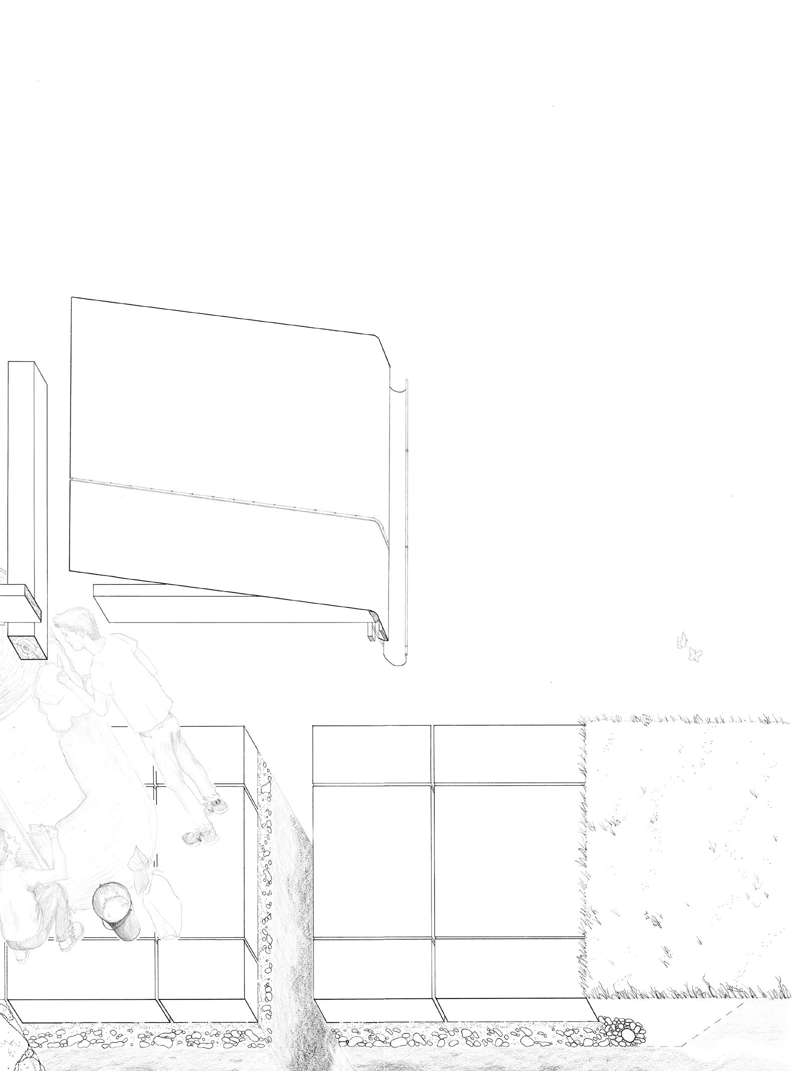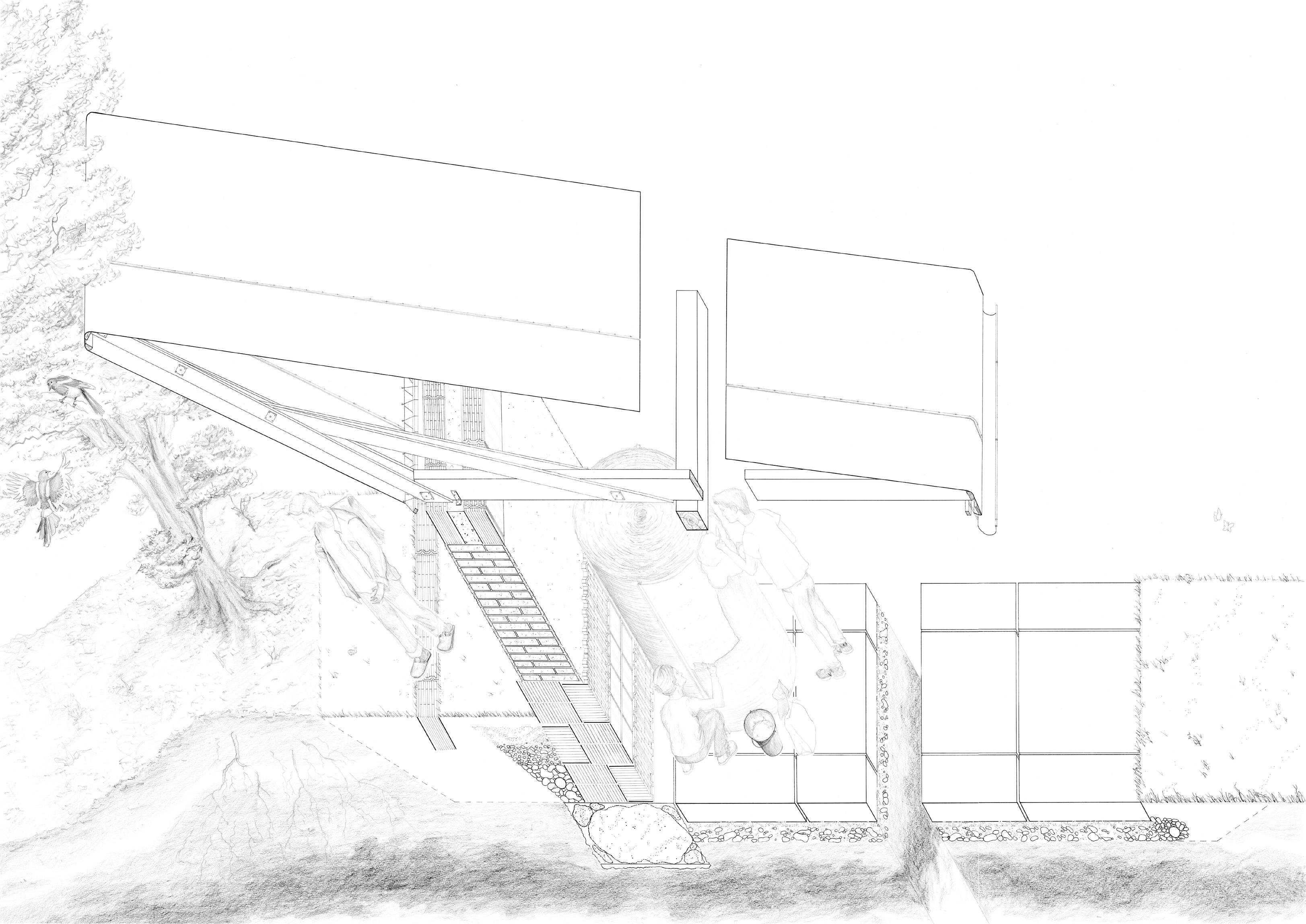 La proposition sur laquelle je travaille utilise les matériaux terre et fermettes. Au sud du parc de l’ENSACF, cette proposition cherche à fabriquer une limite du jardin encore peu dessinée et libre d’usage. Cette halle se résume à un mur de terre qui referme le parc et lui offre une façade à même de devenir une vitrine d’exposition des expérimentations en cours à l’école. Les assemblages et la mise en œuvre de cette halle sont pensés dans un temps long. Cela crée des espaces aux qualités changeantes à toutes les étapes de son processus de construction et de déconstruction. Les matériaux, issus de filière locale, sont également tous réemployables (fondations superficielles, mur d’adobe, charpente en bois, toile en toiture).