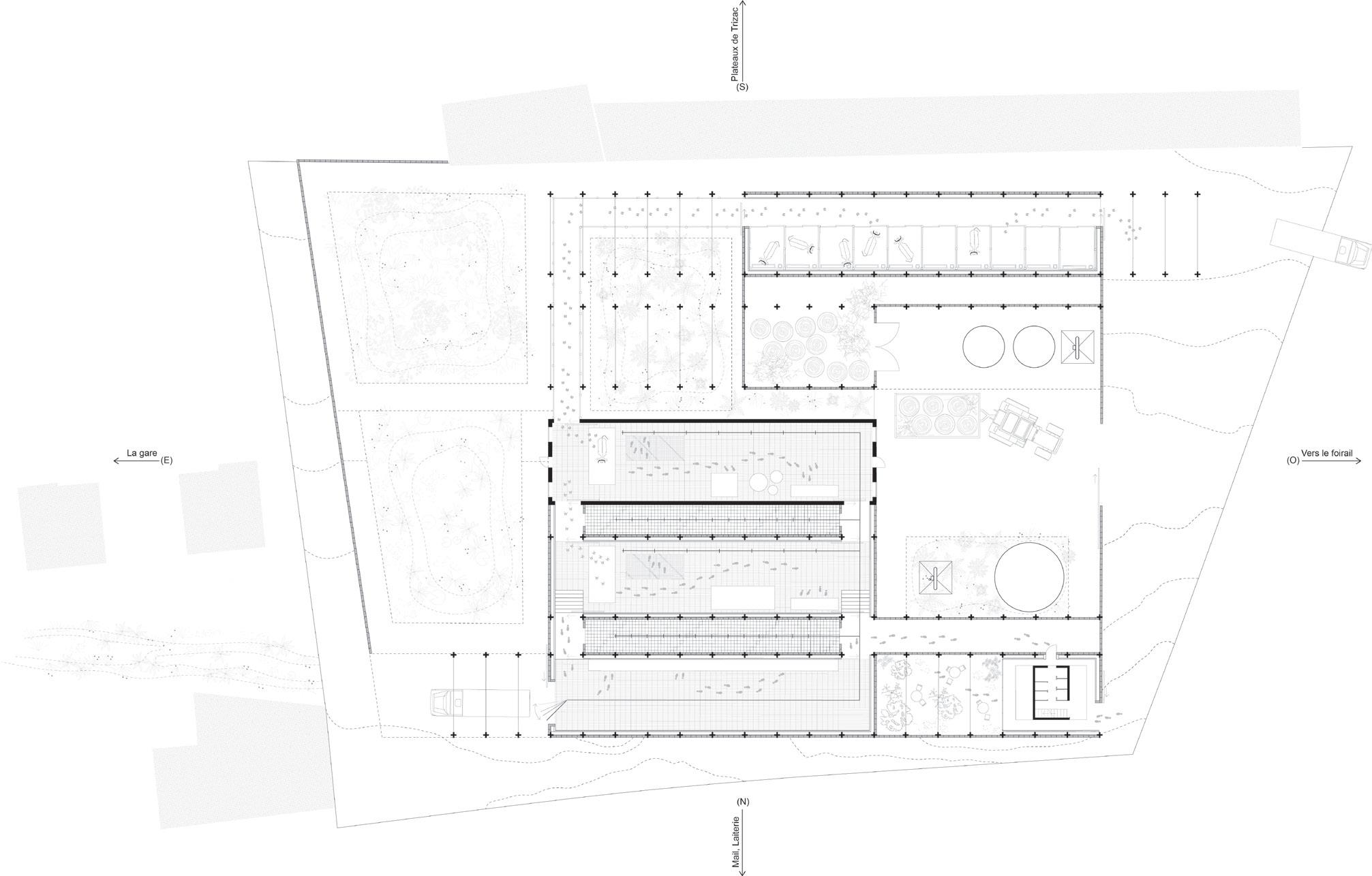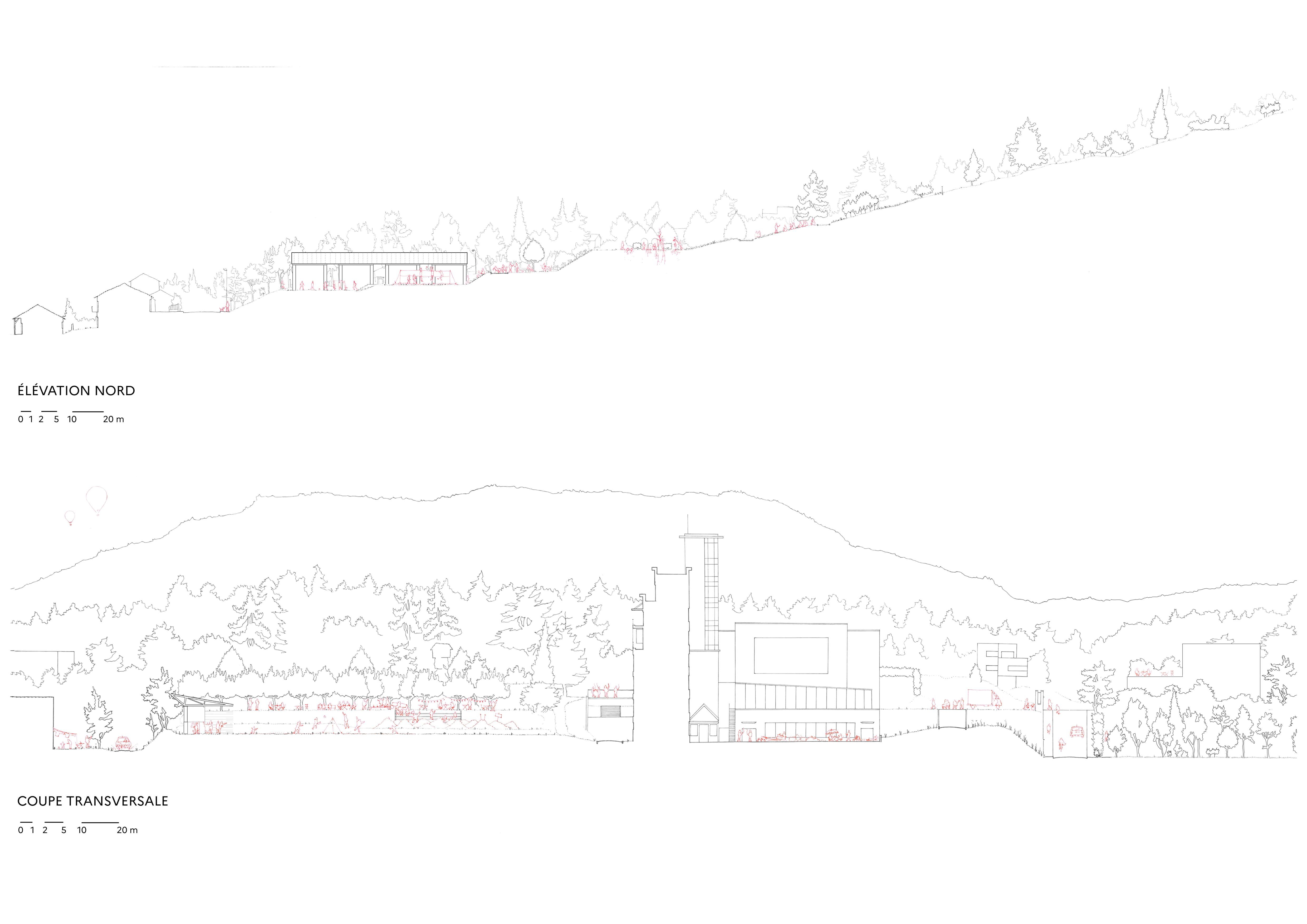 La halle d’éxpérimentation dans le parc de l'ENSACF Coupes paysagères (longitudinale et transversale) | 1 : 200