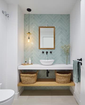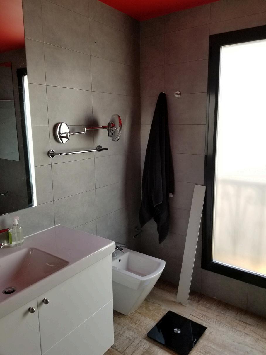Al igual que en el caso anterior, ampliaremos la pared para posteriormente crear una hornacina de obra, esta vez mucho mas grande, que nos permitirá, posteriormente, colocar unas baldas, que servirán de almacenaje. La pared quedará revestida del mismo material que el resto de la baño, y el interior de la hornacina lo pintaremos con el color