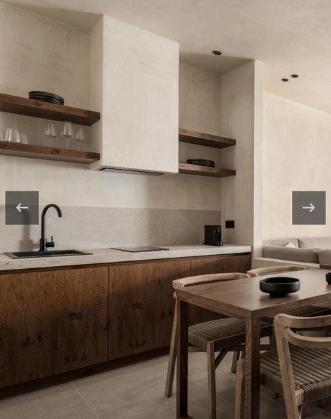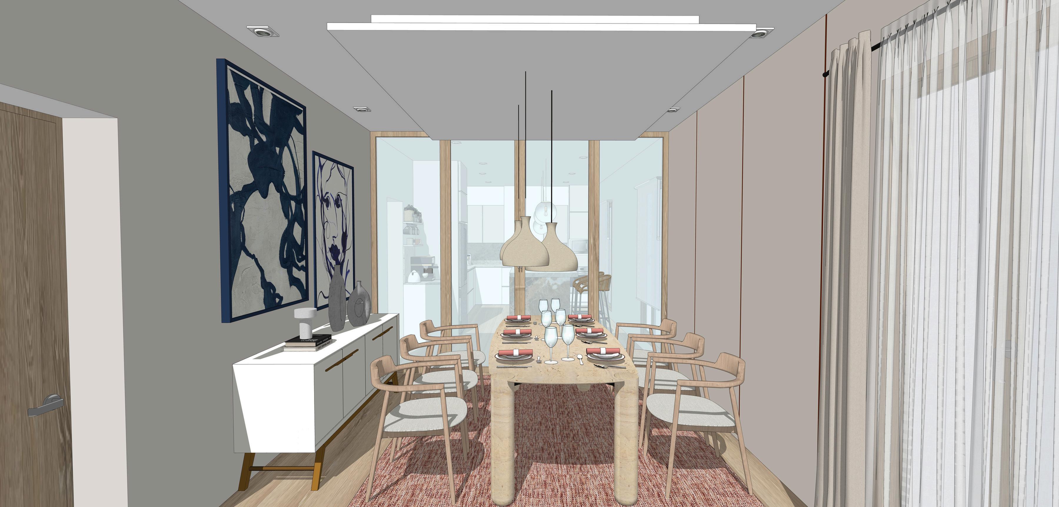 Seguido de la cocina y de alguna manera unida a esta, nos encontramos con el comedor. En el centro de este espacio, una mesa de travertino sólida, cuidadosamente seleccionada, se erige como el epicentro de la reunión. Su superficie pulida refleja la luz tenue de las luminarias suspendidas sobre ella, arrojando una luz suave y agradable, invitando a los comensales a sentarse y disfrutar de una comida tranquila y deliciosa.