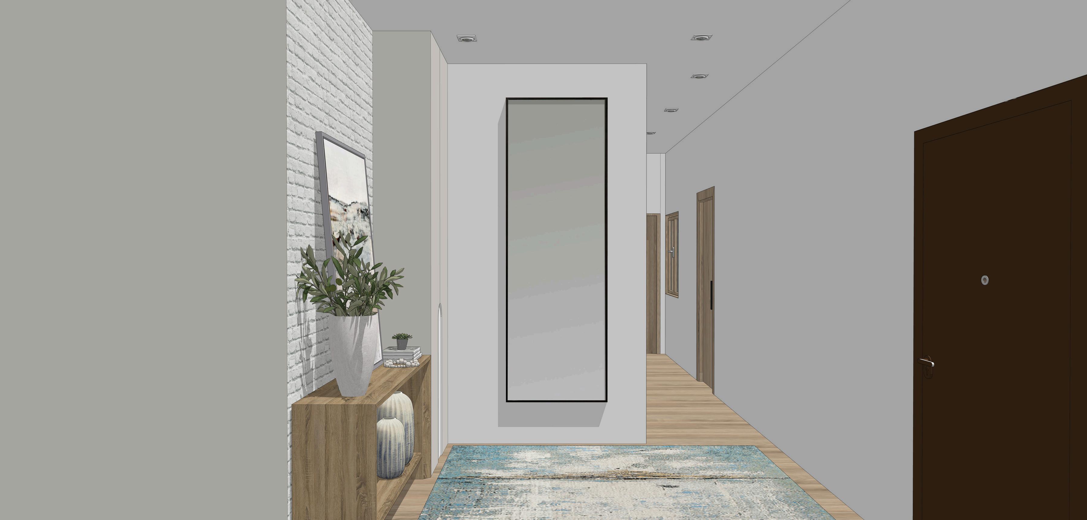 En el encontramos una consola de madera de pino natural donde colocaremos piezas decorativas de la colección de Javier. Además crearemos un armario zapatero a medida que nos de un almacenamiento extra.
