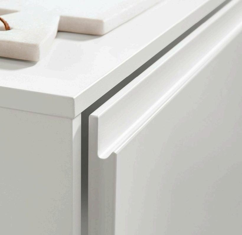Están compuestos por melamina de 16 mm, lacada en color blanco mate y con tirador en forma de uñero (imagen superior). La altura de cada modulo es de 800 mm, y las patas regulables de 100 mm, lo que supone un total de 900 mm, a lo que sumaremos la encimera de 25 mm. La anchura dependerá del mueble e ira desde los 600 mm hasta los 1200 mm.