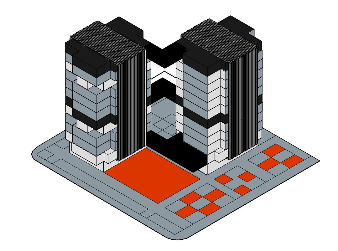 Ubicado en el sector Iñaquito Bajo, el proyecto en altura se empleza frente a la plataforma gubernamental, con el propósito de dar solución al alto crecimiento poblacional que se ha dado en los últimos años. El uso es mixto, con comercio en la planta baja para tener una conexión usuario - proyecto activa y así lograr unir al sector; con el mismo propósito se crean dos torres con uso residencial y administrativo respectivamente, unidas entre sí mediante puentes internos que permiten crear una relación directra entre ambas partes del proyecto.