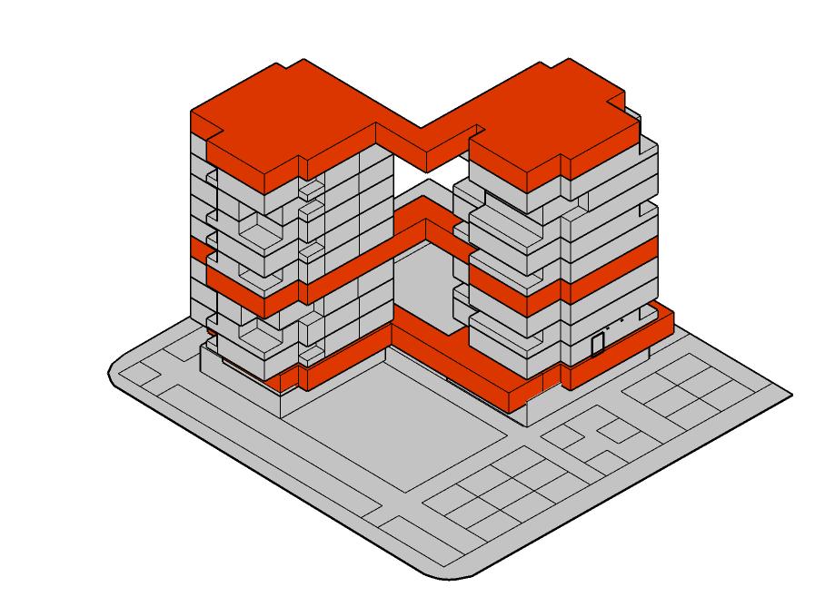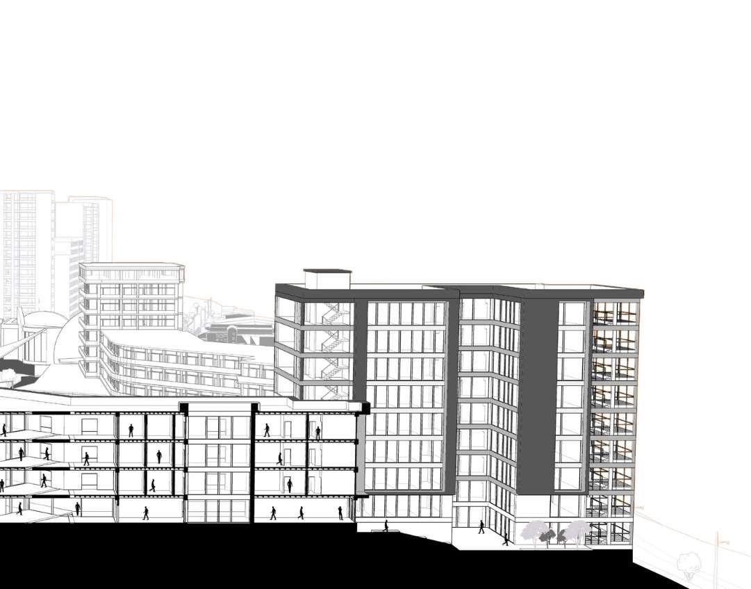Para generar una transición entre edificaciones antiguas con carácter de vivienda y comercio, se genera un nuevo bloque para el Hotel Quito, siguiendo la morfología y estructura del mismo. Este está enfocado en viviendas únicamente para residentes del sector, con comercio en planta baja para la unión usuario - proyecto y la generación de nuevos puestos de trabajo para la zona.