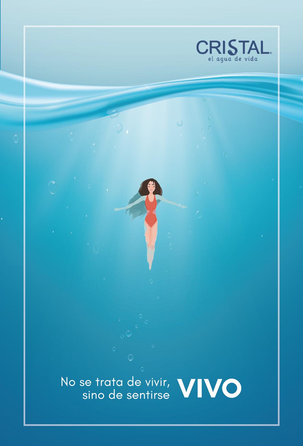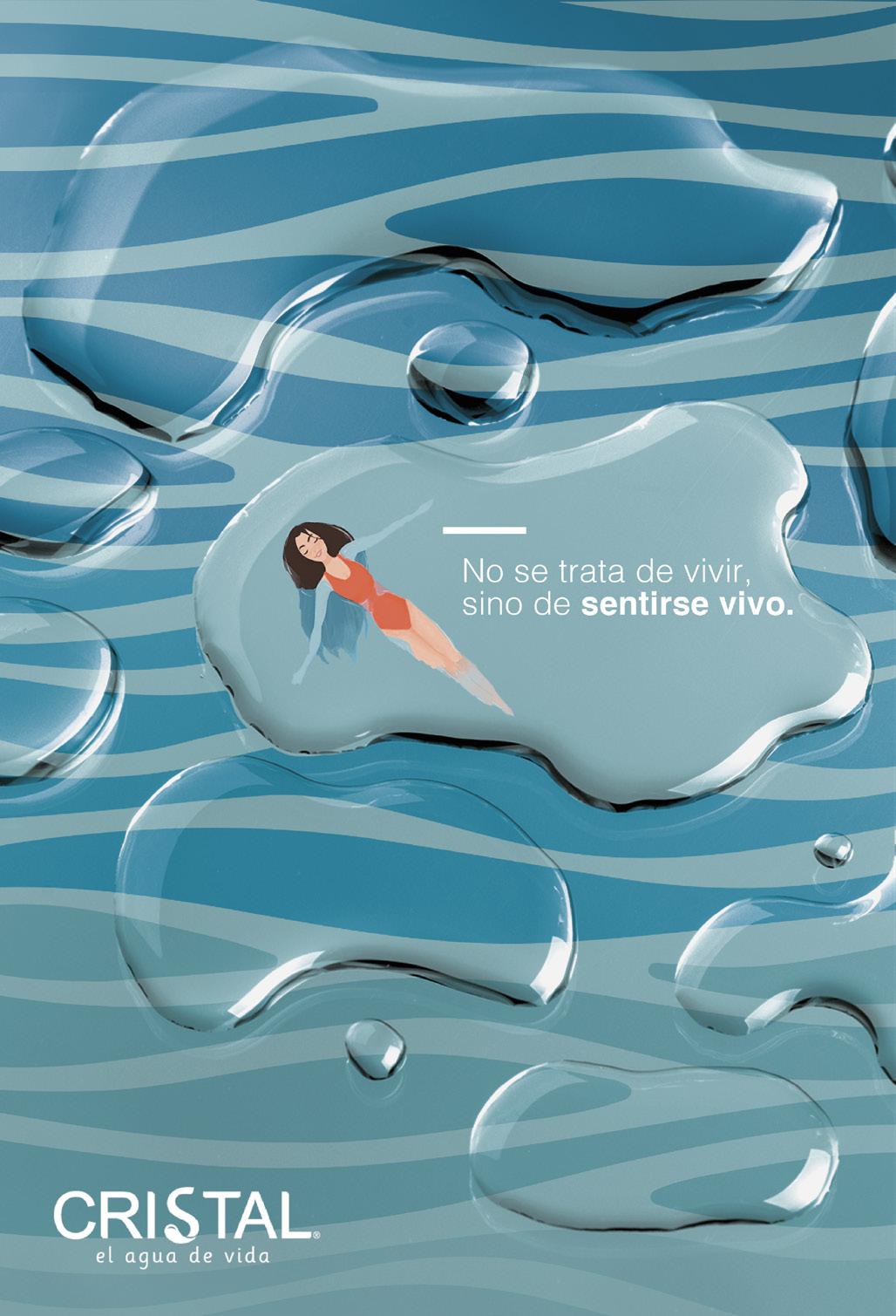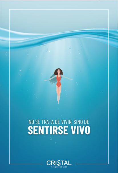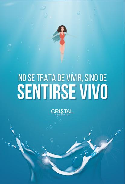 Título: No se trata de vivir, sino de sentirte vivo. Texto de anclaje: El agua de vida. Marca: Agua Cristal.