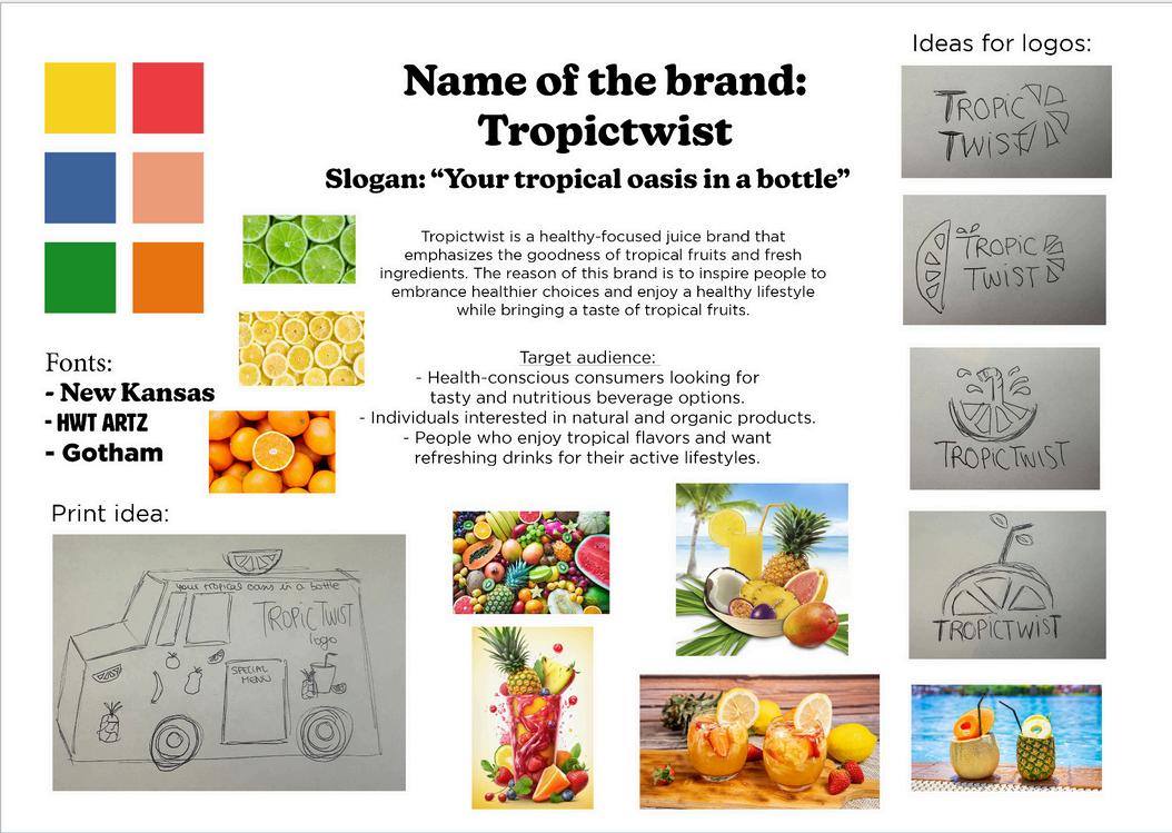 Forthisproject,thegoalwascreatinganoriginaland uniquepackagingproduct.Mybrand’snameis“Tropic Twist”andisahealthy-focusedjuicebrandthat emphasizesthegoodnessoftropicalfruitsandfresh ingredients.Thesloganis“Yourtropicaloasisinabottle.”