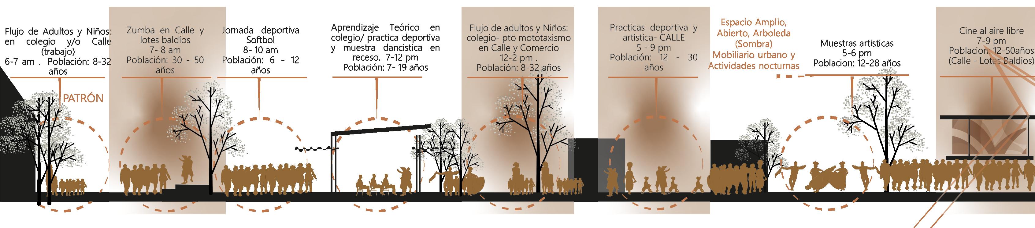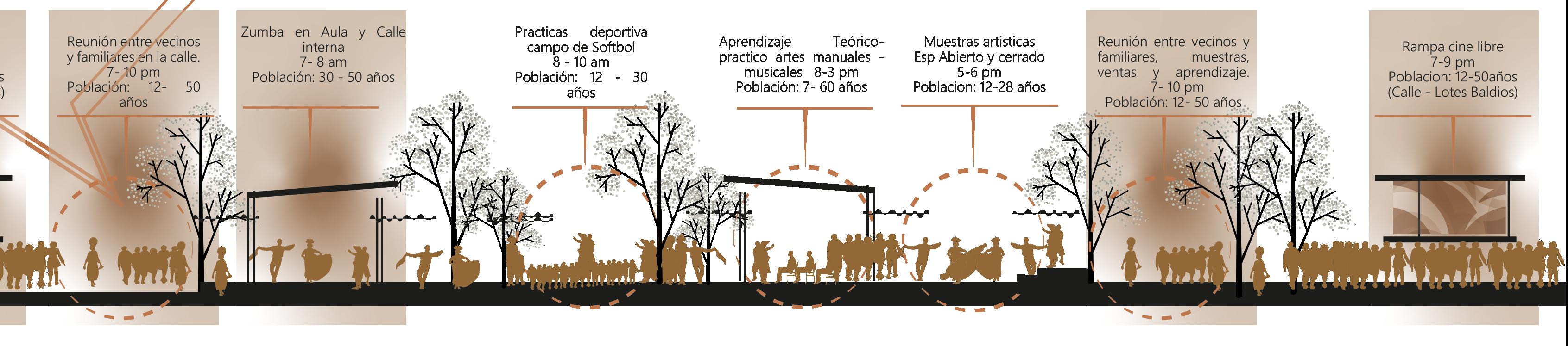 El proyecto se planta con el objetivo de reactivar y resignificar un hito barrial, caracterizado por poseer grandes dimensiones, ser intersección de las vías primarias que conectan con la ciudad, incluir actividades deportivas como lo son el Softbol y por poseer riesgo de inundación. Ante ello, se plantea un equipamiento deportivo y artístico que satisfaga los modos de habitar actuales de la población y así mismo incluir espacios caracterizadores como lo son la “Calle” en donde surgen todo tipo de actividades tanto su proceso teórico, práctica y muestra. El proyecto se organiza alrededor del corazón del proyecto (la cancha de softbol) y a sus alrededores se disponen dos barras divididas en la horizontal para traer el concepto de la “calle” al interior del edificio.