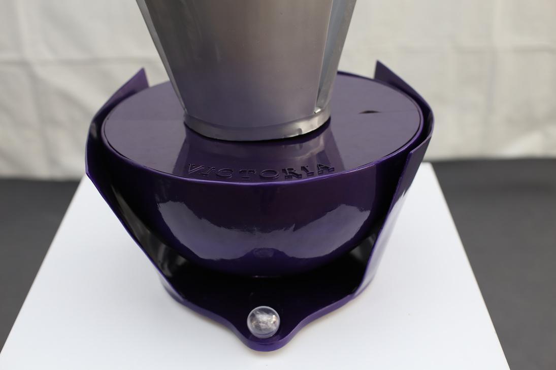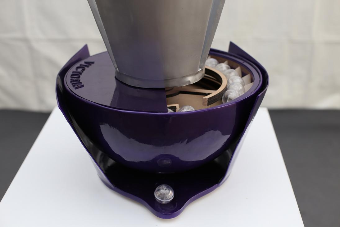 VICTORIA es un dispensador de esferas con Kisses en su interior el cual tiene un sistema de giro accionado por tres superficies que se giran hacia la derecha, expulsando la esfera en la parte frontal baja,
