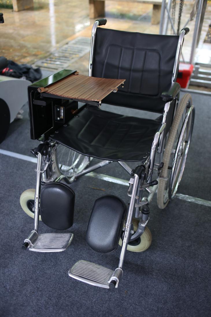 LAAZUS es un accesorio que se puede unir a cualquier silla de ruedas. Se basa en una mesa plegable de madera que se saca de uno de los apoya brazos hecho de acrílico, para facilitar el apoyo de elementos como cuaderno o computador.