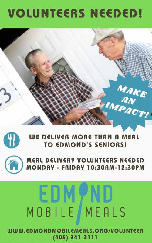 main living independently at home for as long as possible. The program serves individuals facing chronic health conditions, mobility challenges, and post-surgery recovery, ensuring they receive the nourishment and human connection necessary to thrive. Each weekday, volunteers deliver an average of 300 meals each day to homebound clients across 100 square miles in Edmond, along with 160 weekend meals for those who need them most.