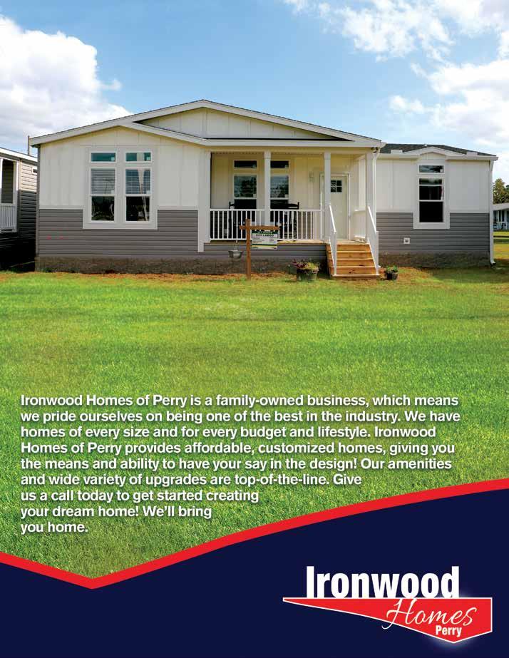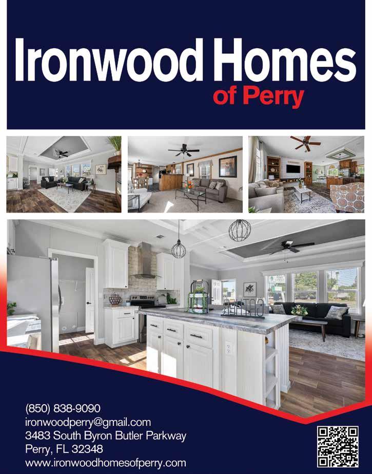 The family at Ironwood Homes of Perry is ready and eager to help you acquire your dream home at a price to fit your budget. They are open Monday through Saturday, from 9 a.m. until 5 p.m. They are available on Sundays by appointment. They can be found at 3483 S. Byron Butler Pkwy., in Perry. You can call them at (850) 838-9090. You can also reach them by email at ironwoodperry@gmail. com. You can see photos and floorplans of all the homes they have on their lot by visiting their website at www. ironwoodhomesofperry.com. Come meet the family of Ironwood Homes of Perry and experience the difference –they will bring you home. ▪