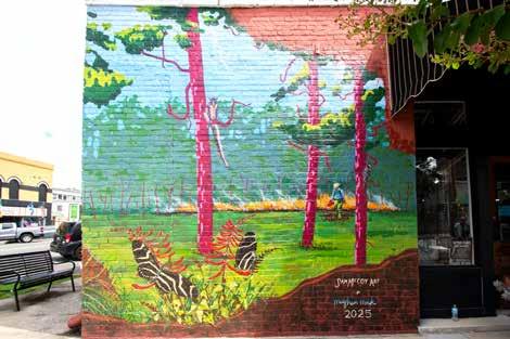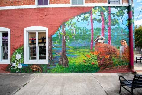 Larger-than-life painted spider lilies bloom brightly now from a section of brick wall between the Vintage Treasures windows facing North Jefferson Street in downtown Monticello, Florida. They anchor the left edge of an expansive wildlife-themed mural named “Dusk in the Longleaf Gap,” which stretches up and around the corner toward the shop’s doors on East Dogwood Street.