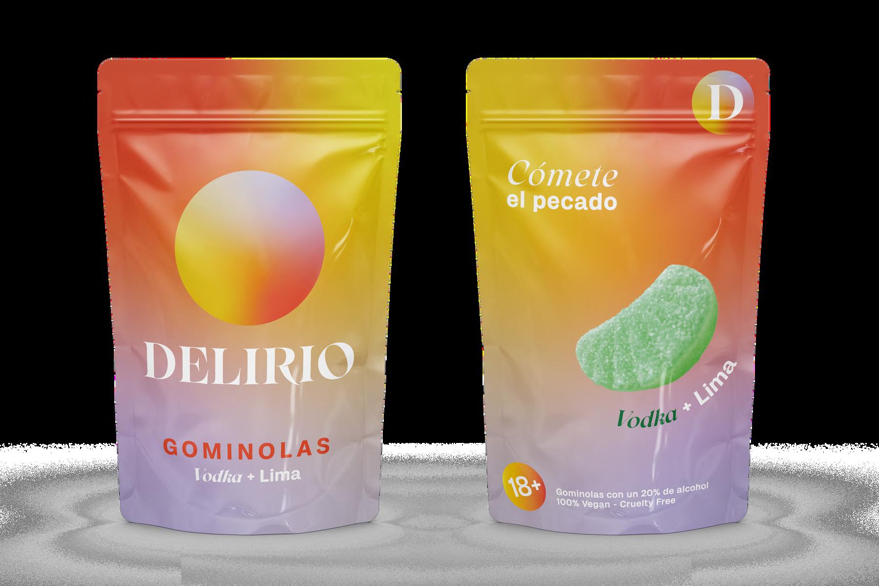 Packaging dels sobres de gominoles DELIRIO, sabor vodka i llima, amb un 20% d'alcohol, veganes, cruelty free i +18 Es mostra la part davantera (esquerra) i la posterior (dreta).