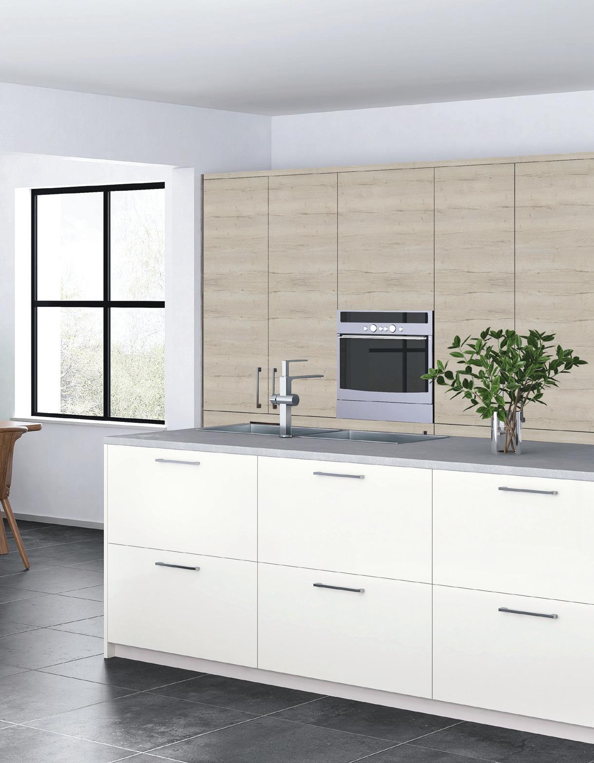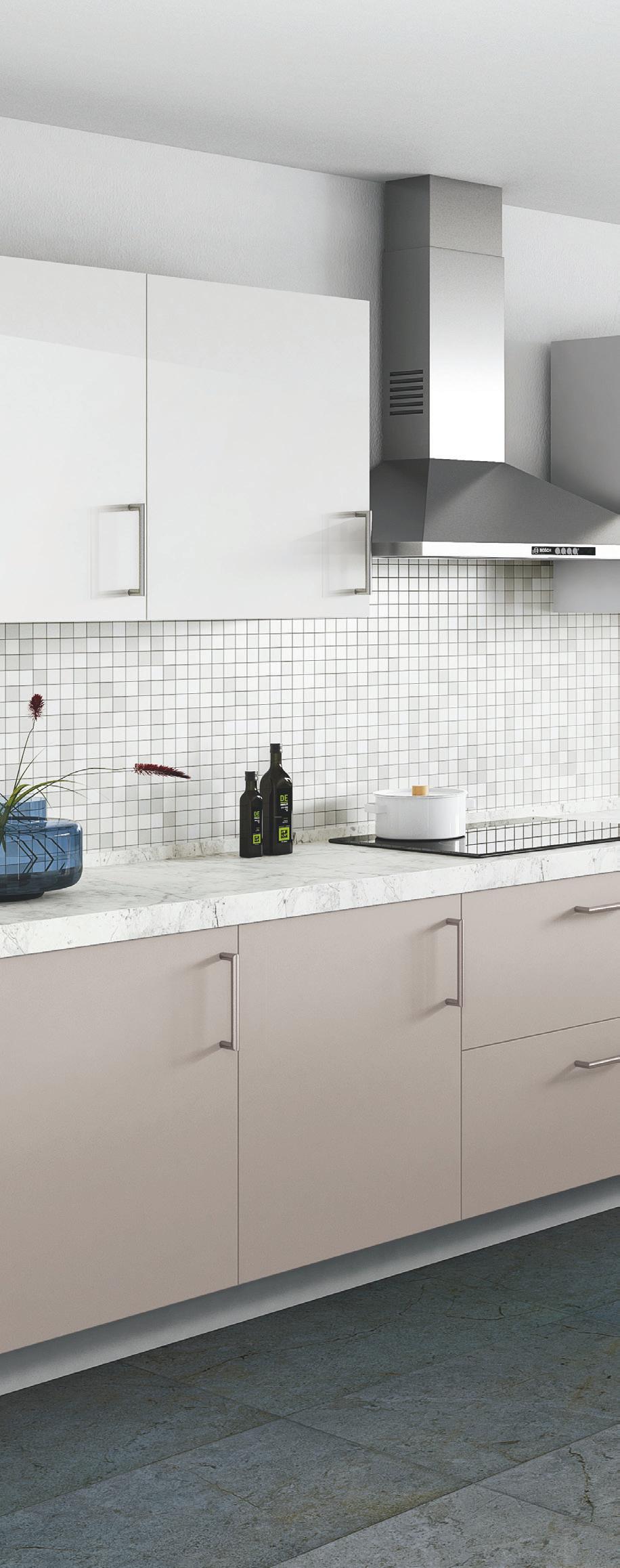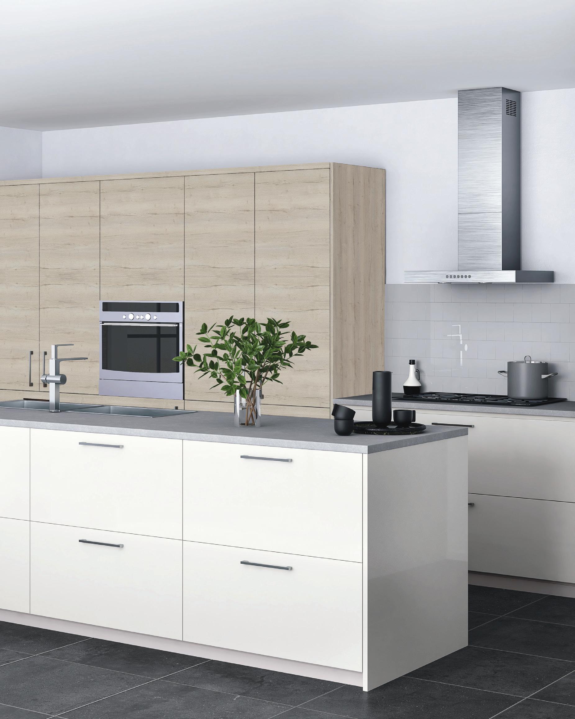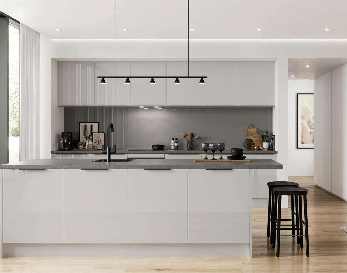 Horizon combines an understated slab door with a statement edge-pull handle for the perfect sleek kitchen effect. Available in matt and gloss finishes and offering two different handles.
