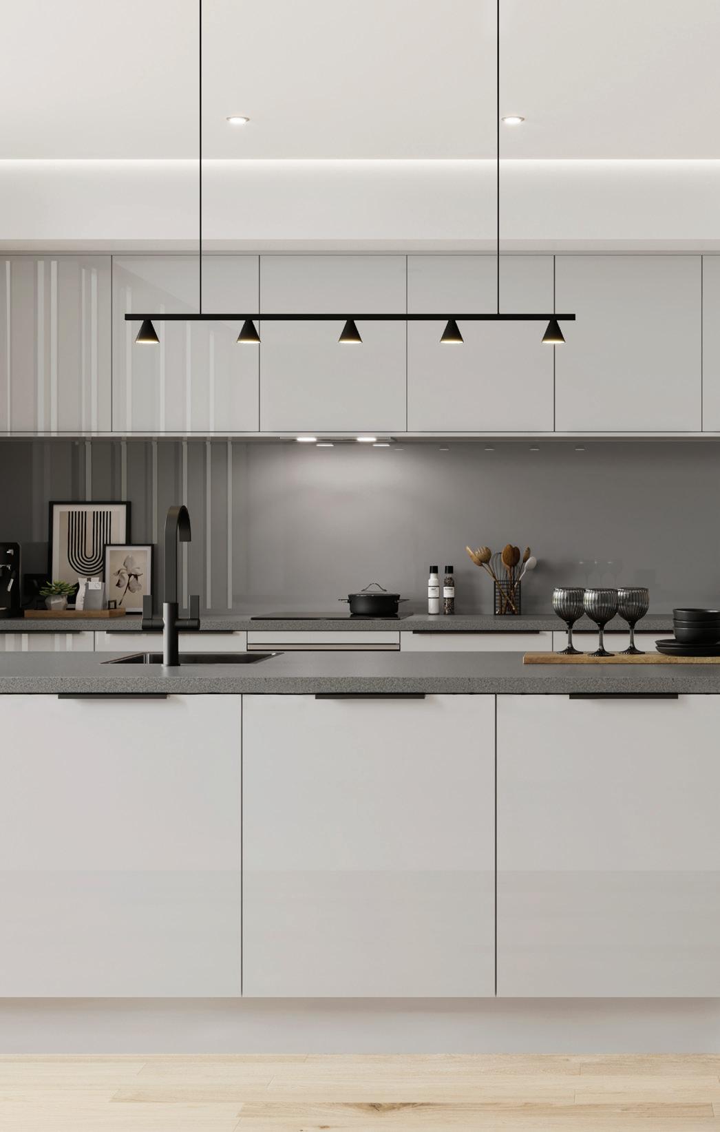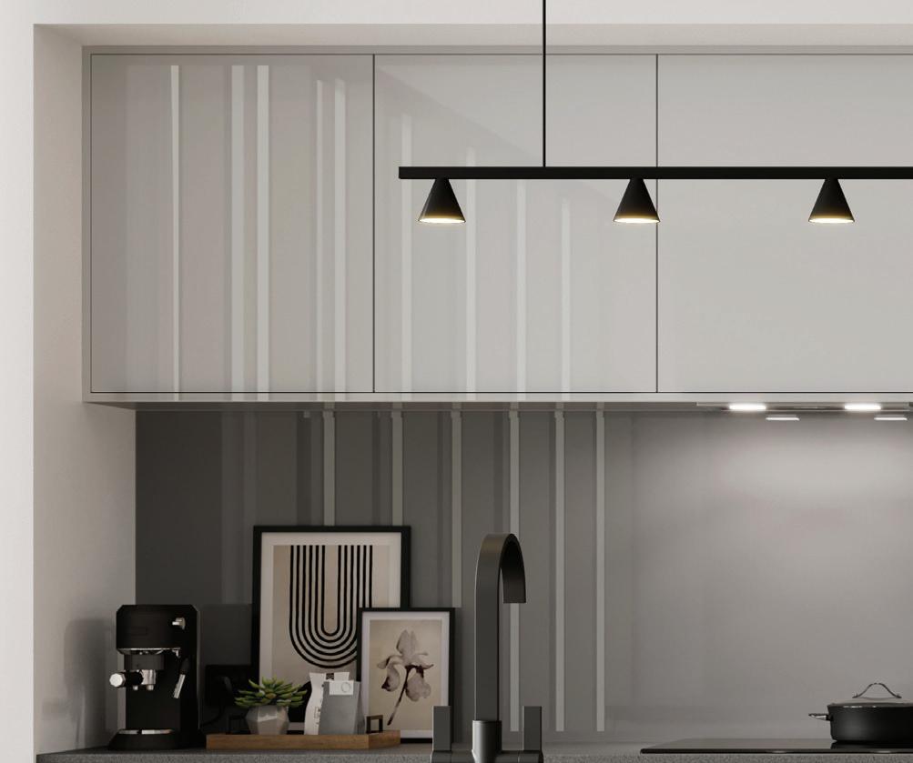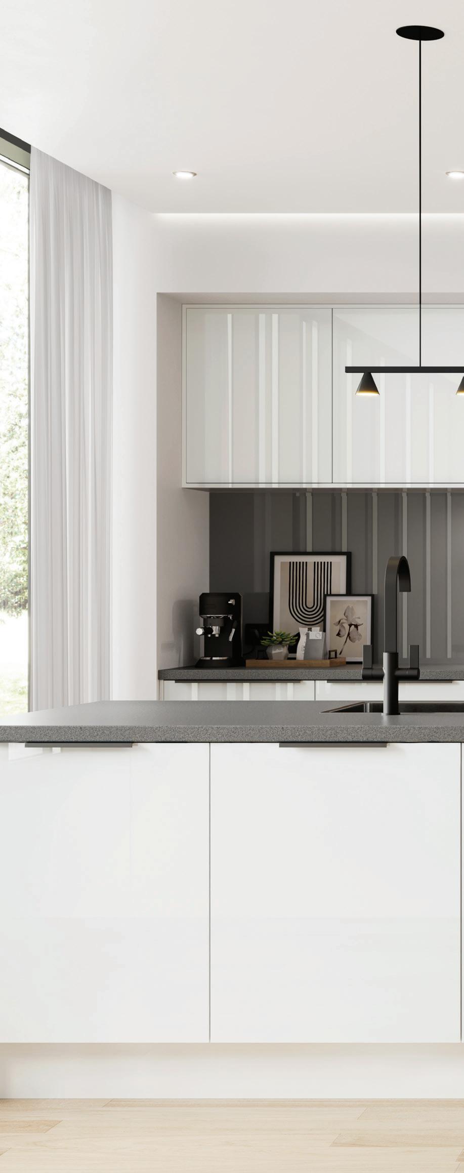 A modern v-groove shaker design available in 3 colours - Pearl Grey, Satin White, and Satin Green. This design effortlessly combines elegance and texture, bringing depth into the kitchen design.