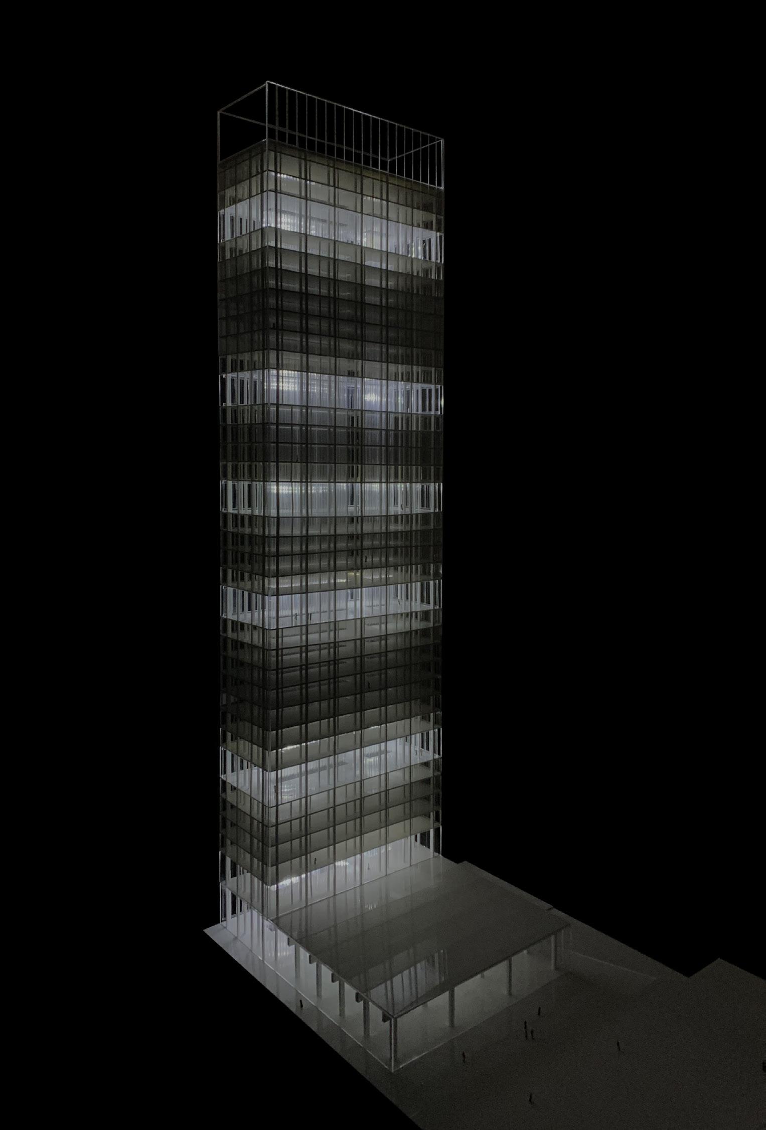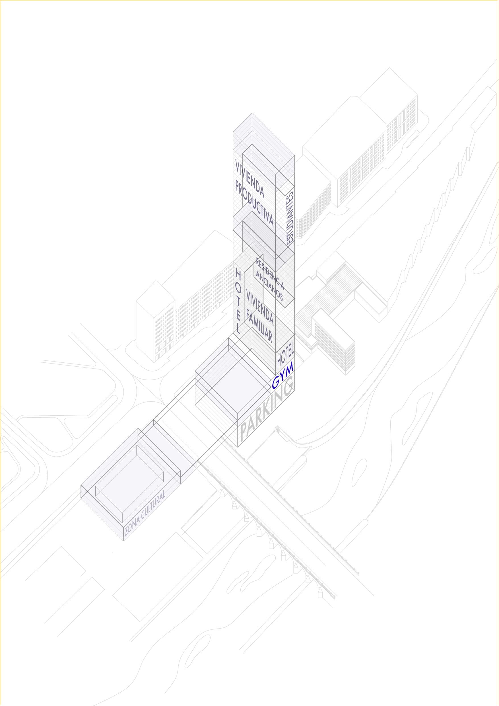 Rem Koolhas hablaba de su fascinación por el funcionamiento de las torres como una superposión no articulada entre partes, dispuestas de manera vertical. Este proyecto, oponiéndose a ello, pone en valor los beneficios de la mezcla de usos, buscando generar complejidad articulada entre las distintas partes como una macla tridimensional en conjunto.